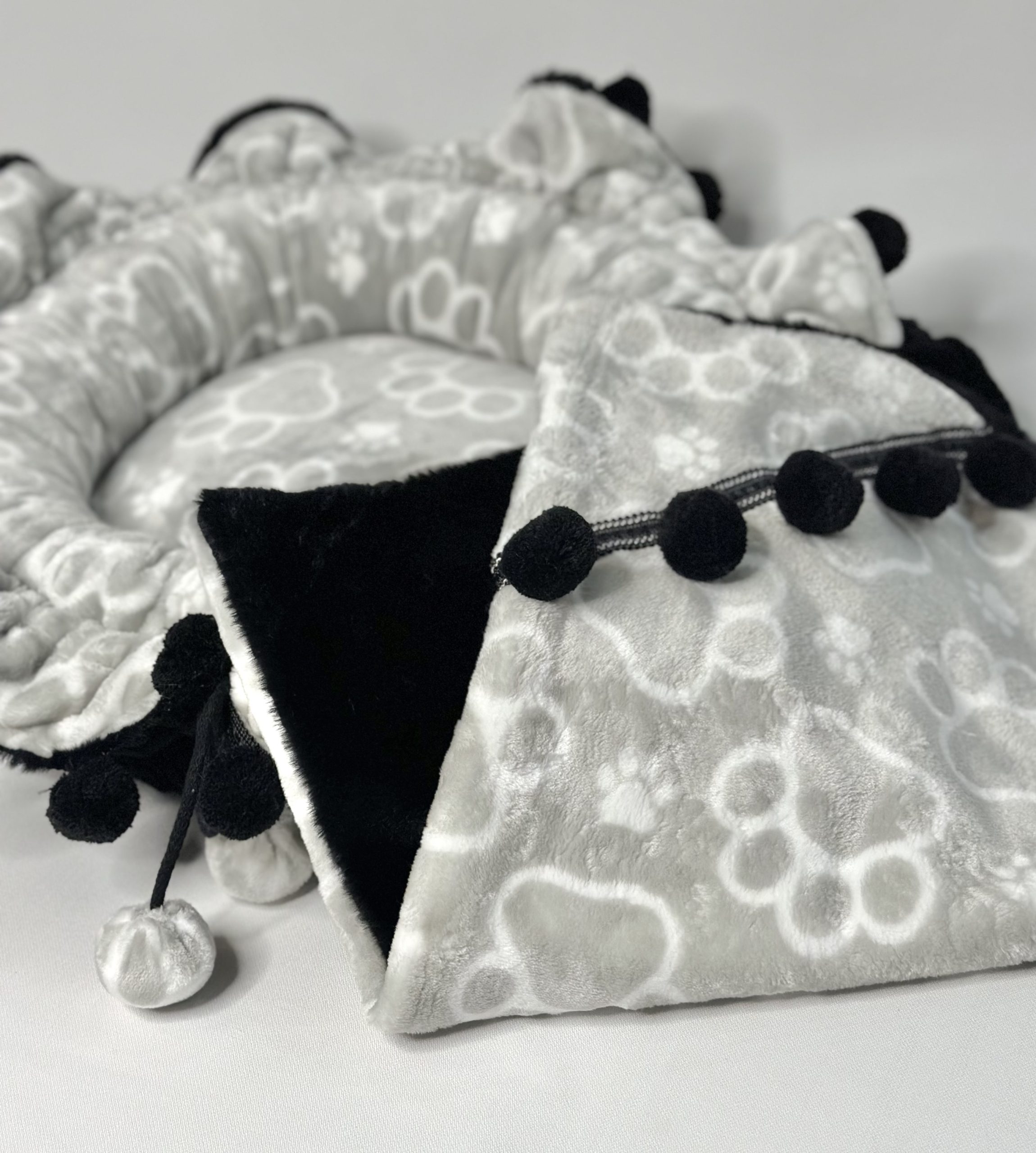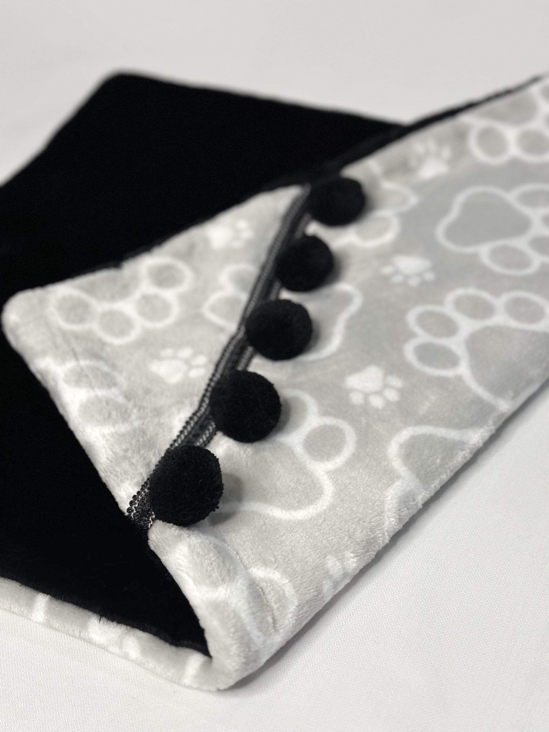 Kocyk z milutkiego futerka w kolorach: czarny / szary + białe psie łapki.