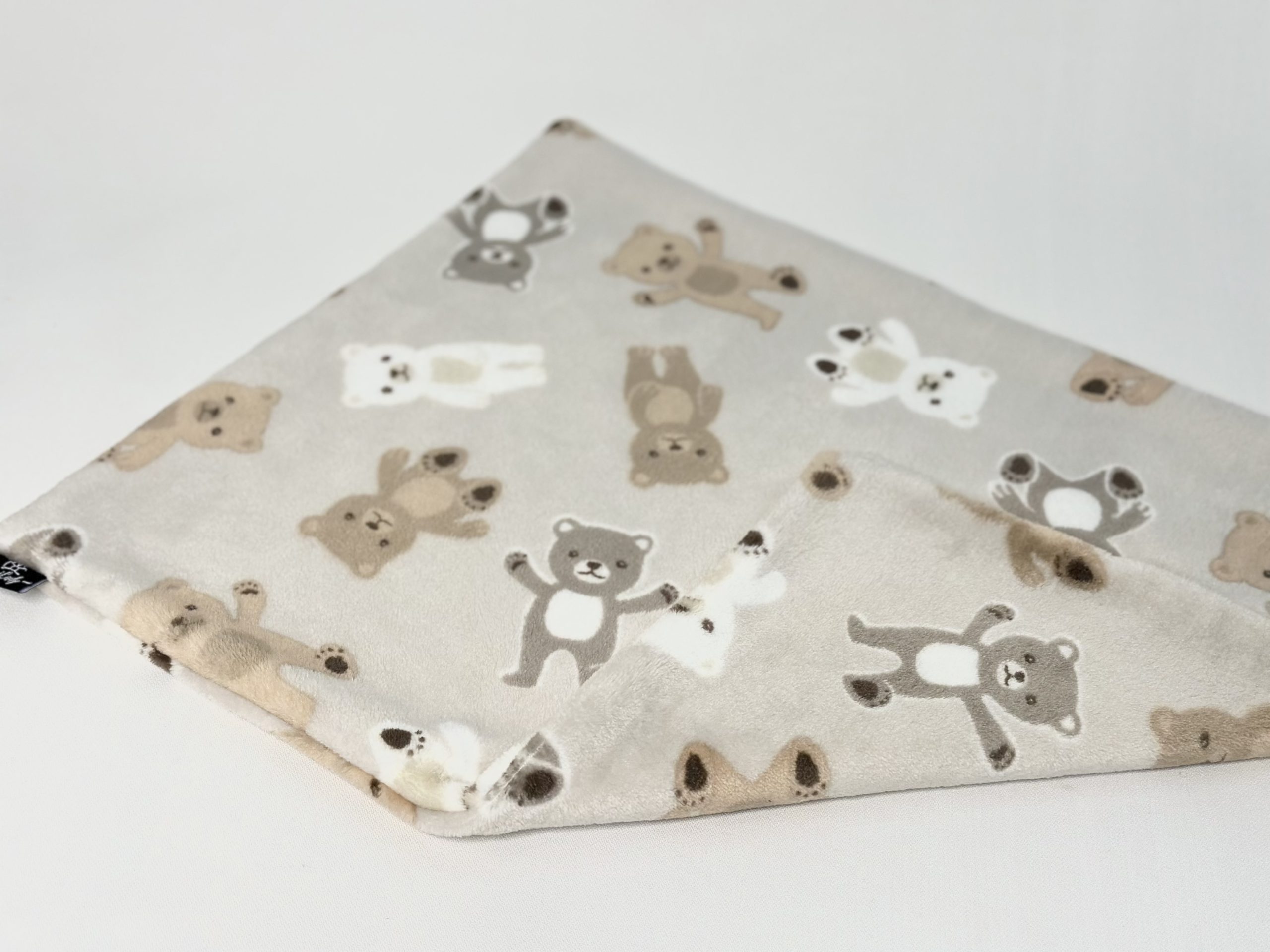 Kocyk z milutkiego materiału z krótkim włoskiem, z wizerunkiem wesołych misiów.