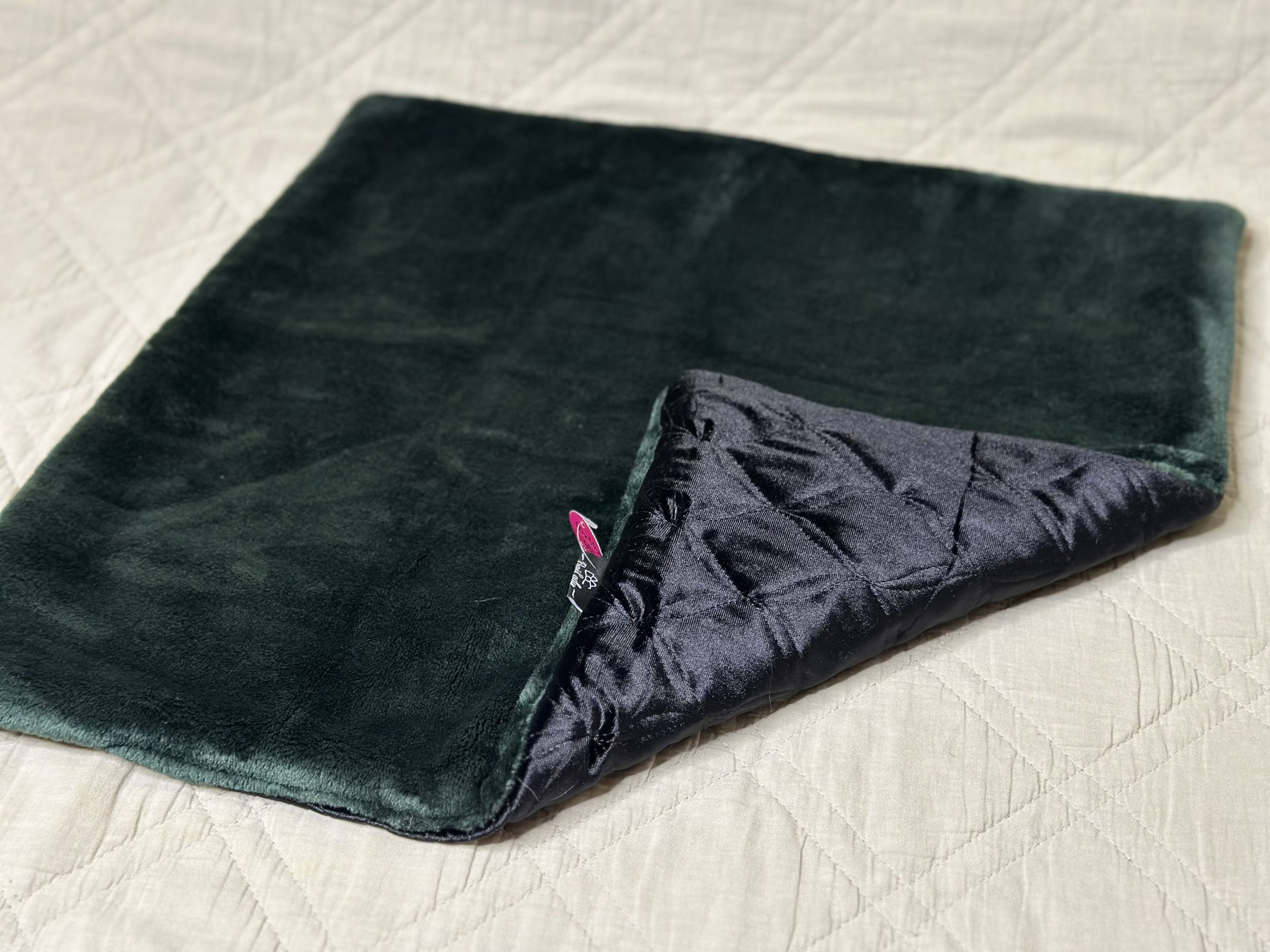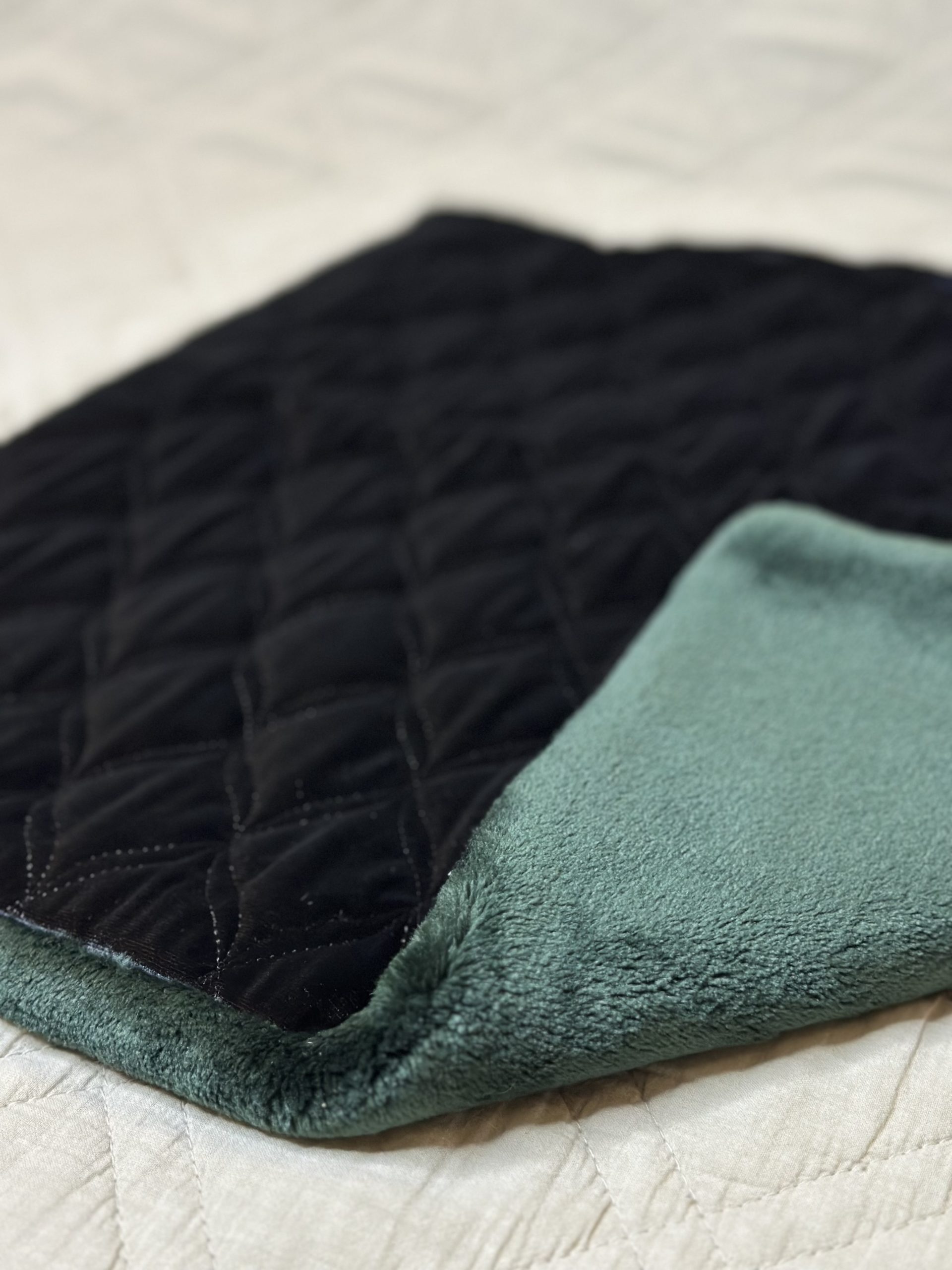Kocyk z milutkiego futerka w kolorze głębokiej, pięknej zieleni, oraz czarnego pikowanego grubego materiału.