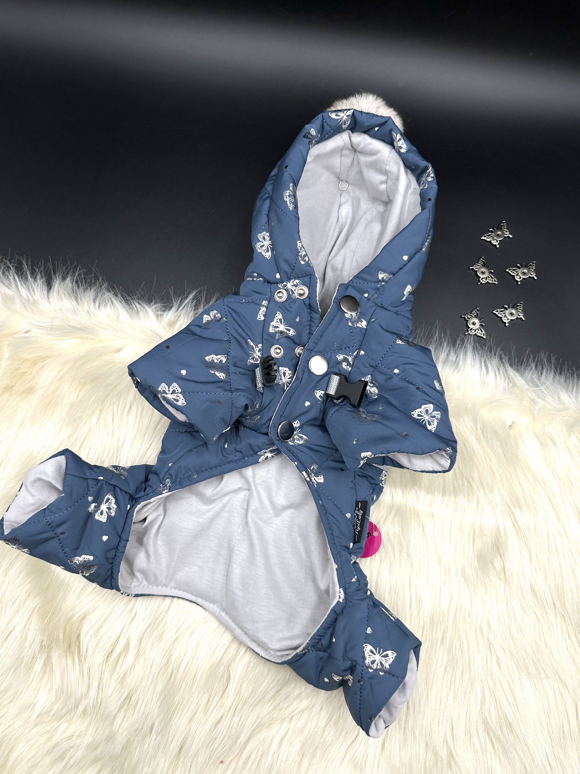 Kombinezon dla pupila z niebieskiego, pikowanego materiału w srebrne motylki to elegancki i stylowy strój, który doda uroku każdemu czworonogowi.