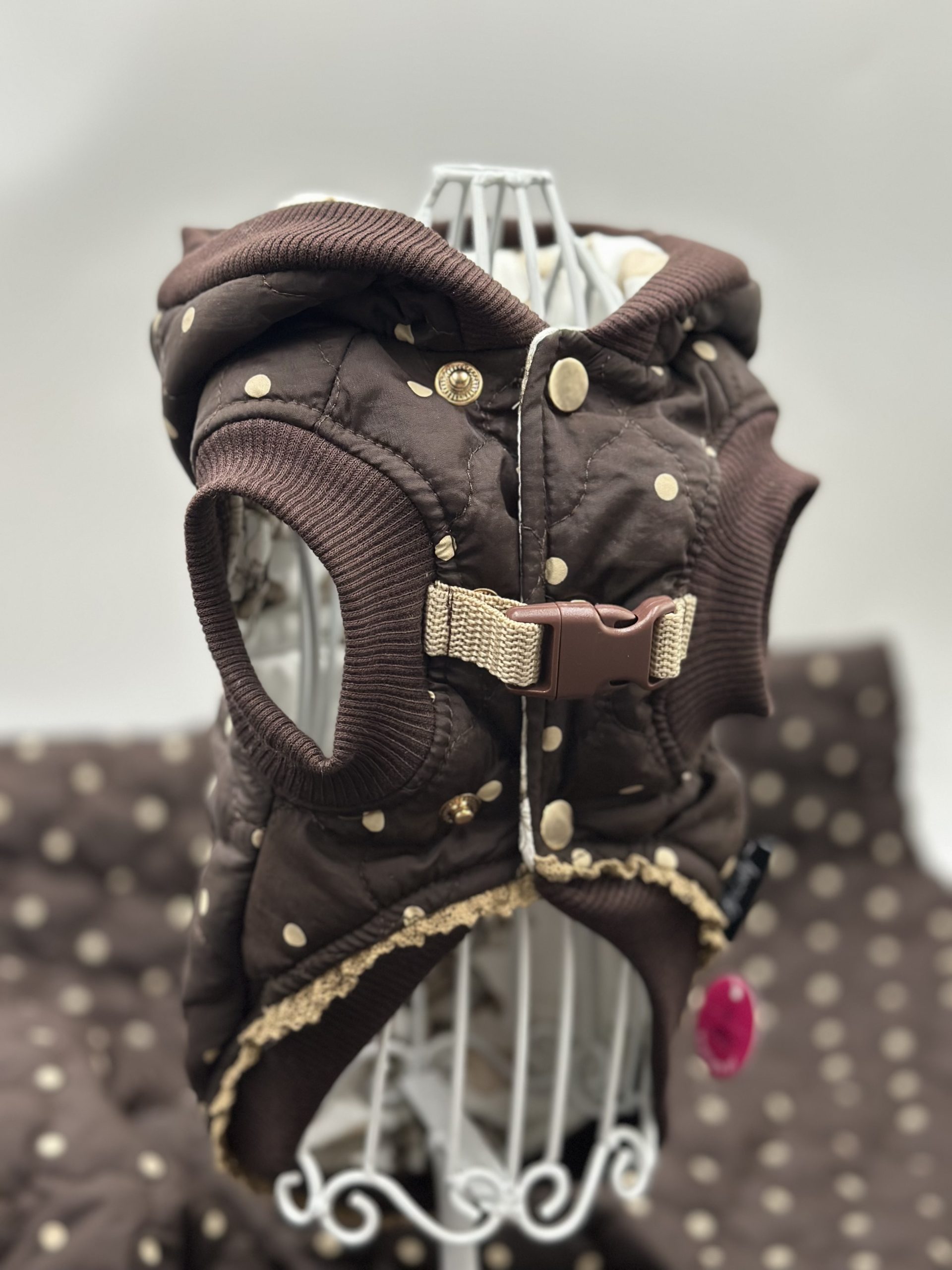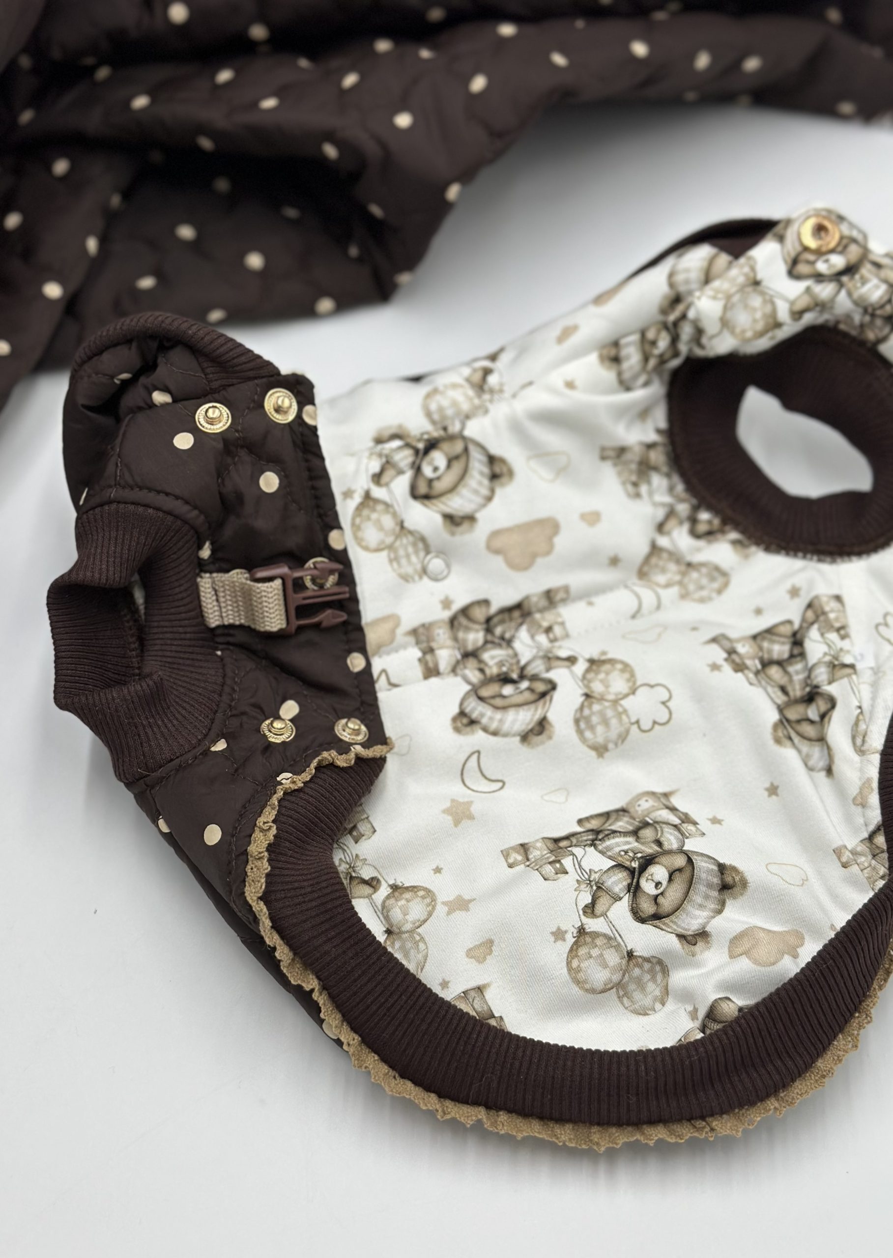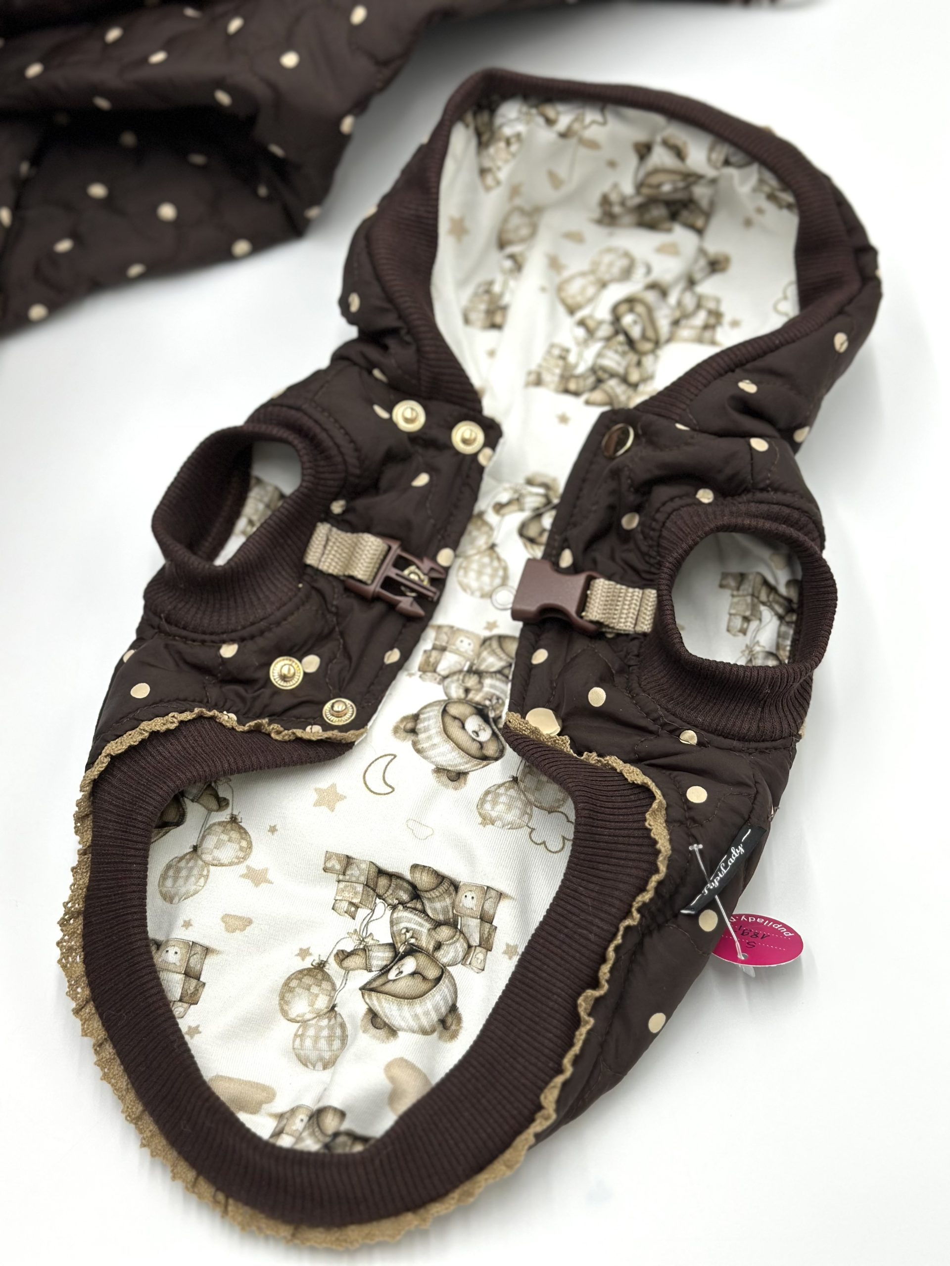 Kaptur jest dopinany na zatrzask aby nie opadał na głowę pieska.