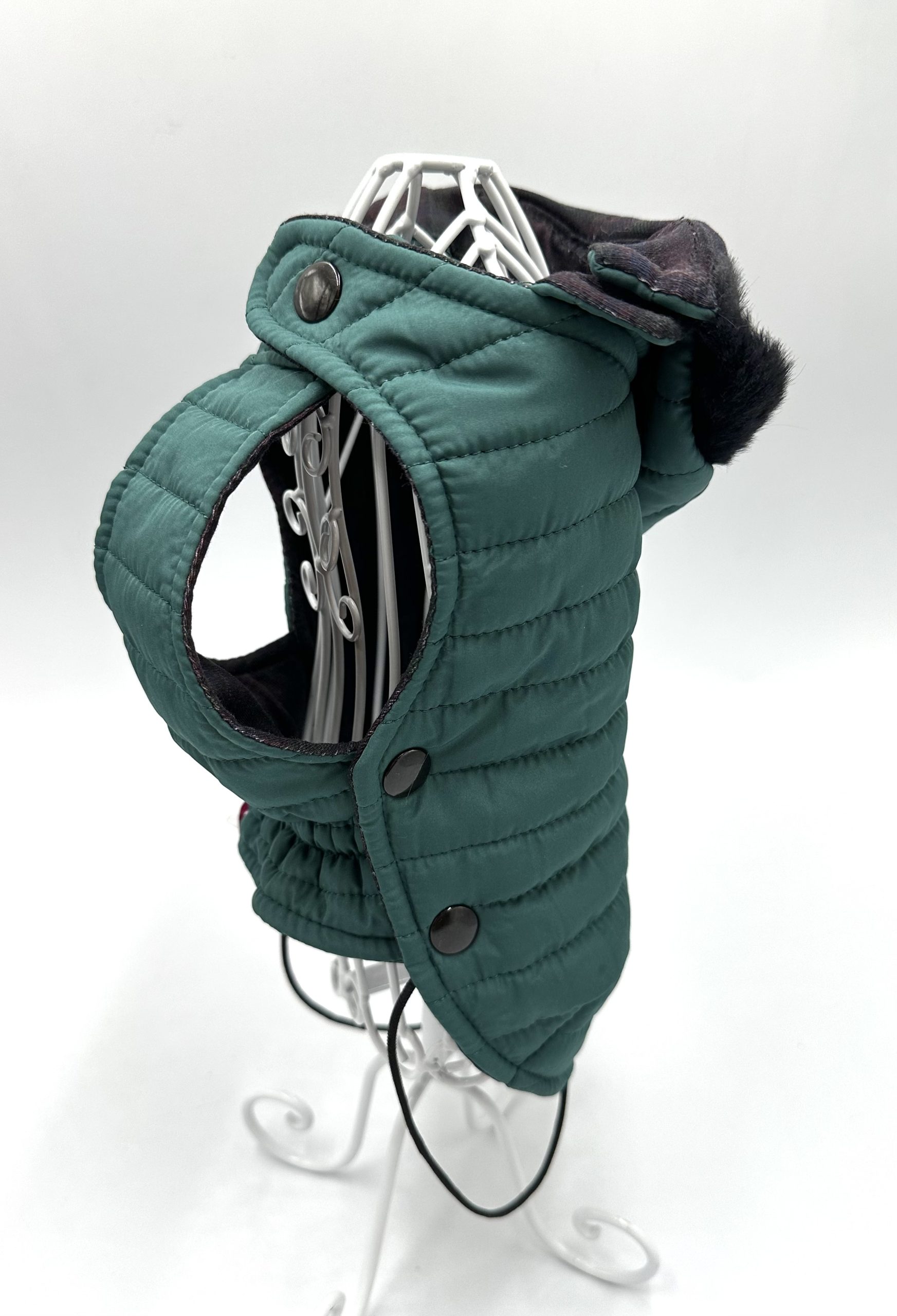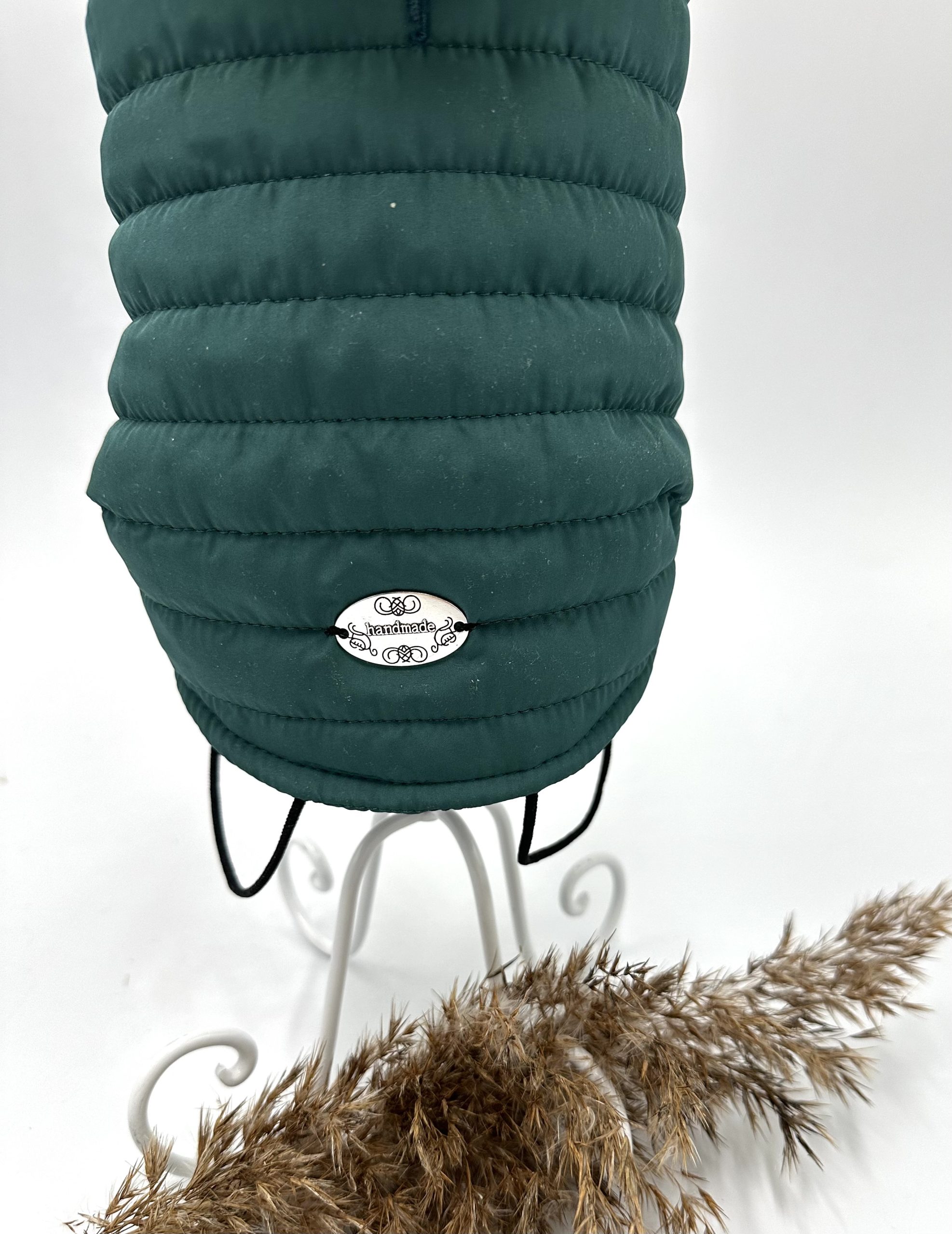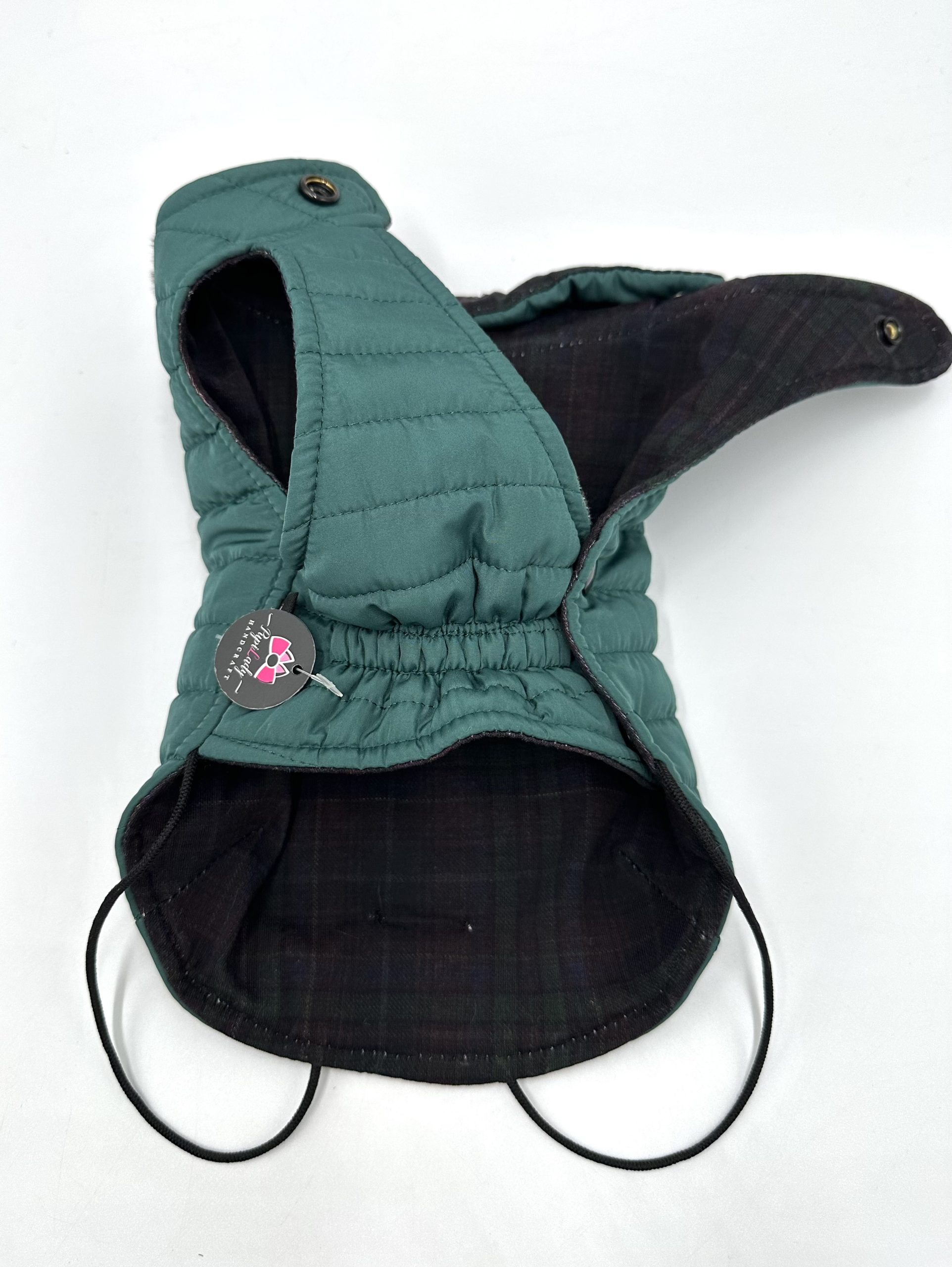 Klasyczna, pikowana kurtka w kolorze ciemnej zieleni, podszyta 100% bawełną w ciemną kratkę.