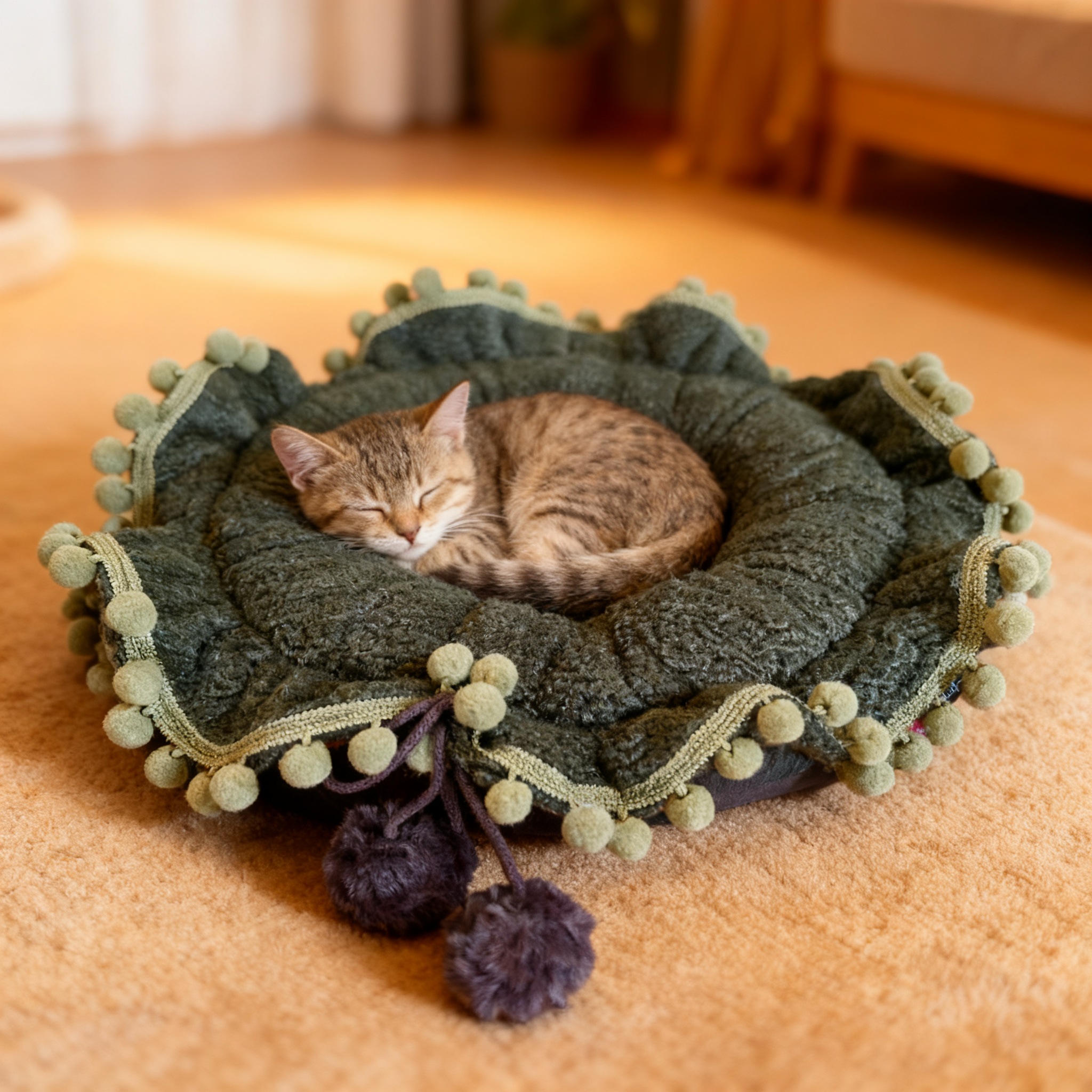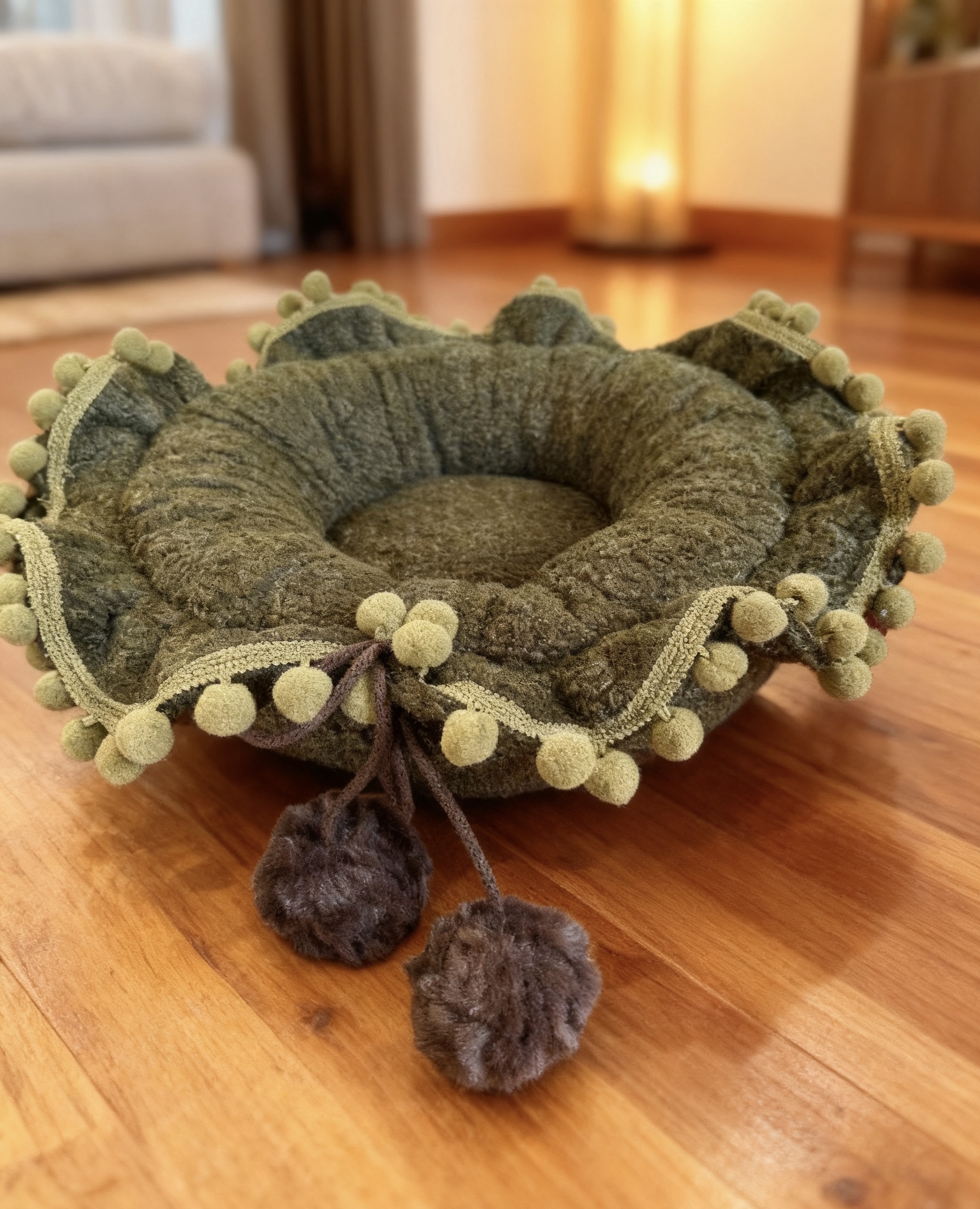 Okrągłe legowisko z materiału o splocie barankowym w kolorze khaki, z dużą falbaną tworzącą falę, obszyte taśmą z małych pomponów w tej samej kolorystyce.
