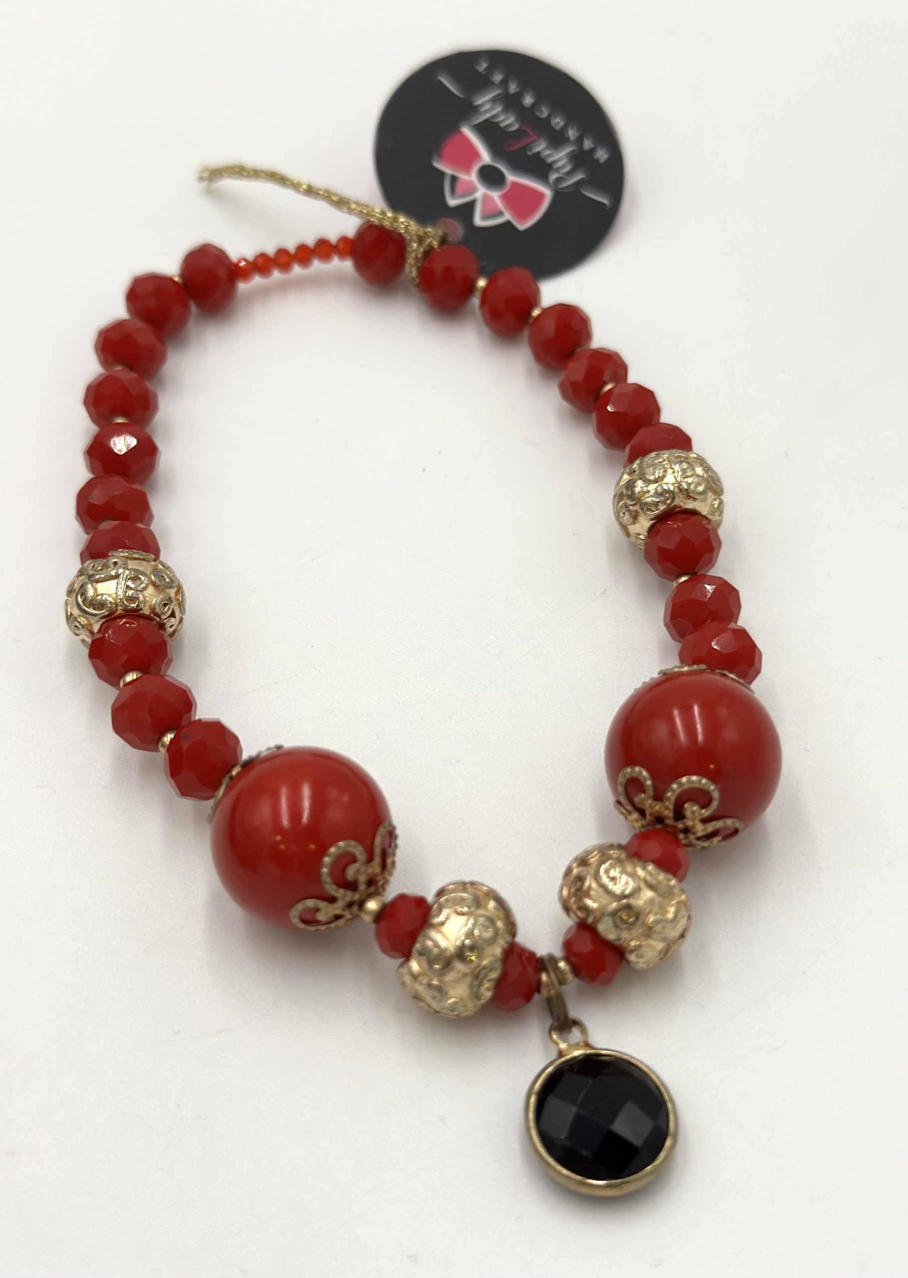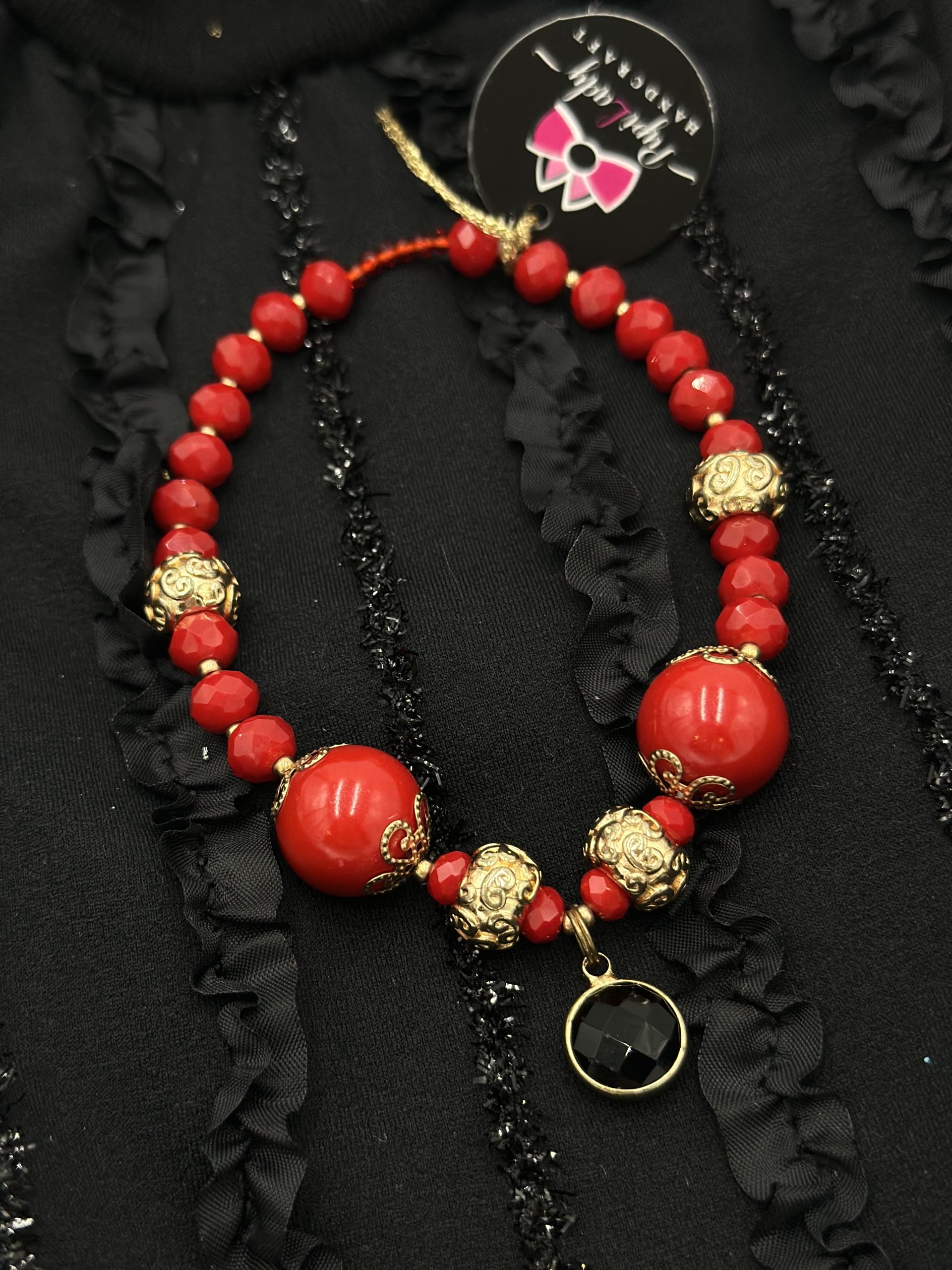 Naszyjnik ozdobny z czerwonych kamieni połączonych złotymi dodatkami.