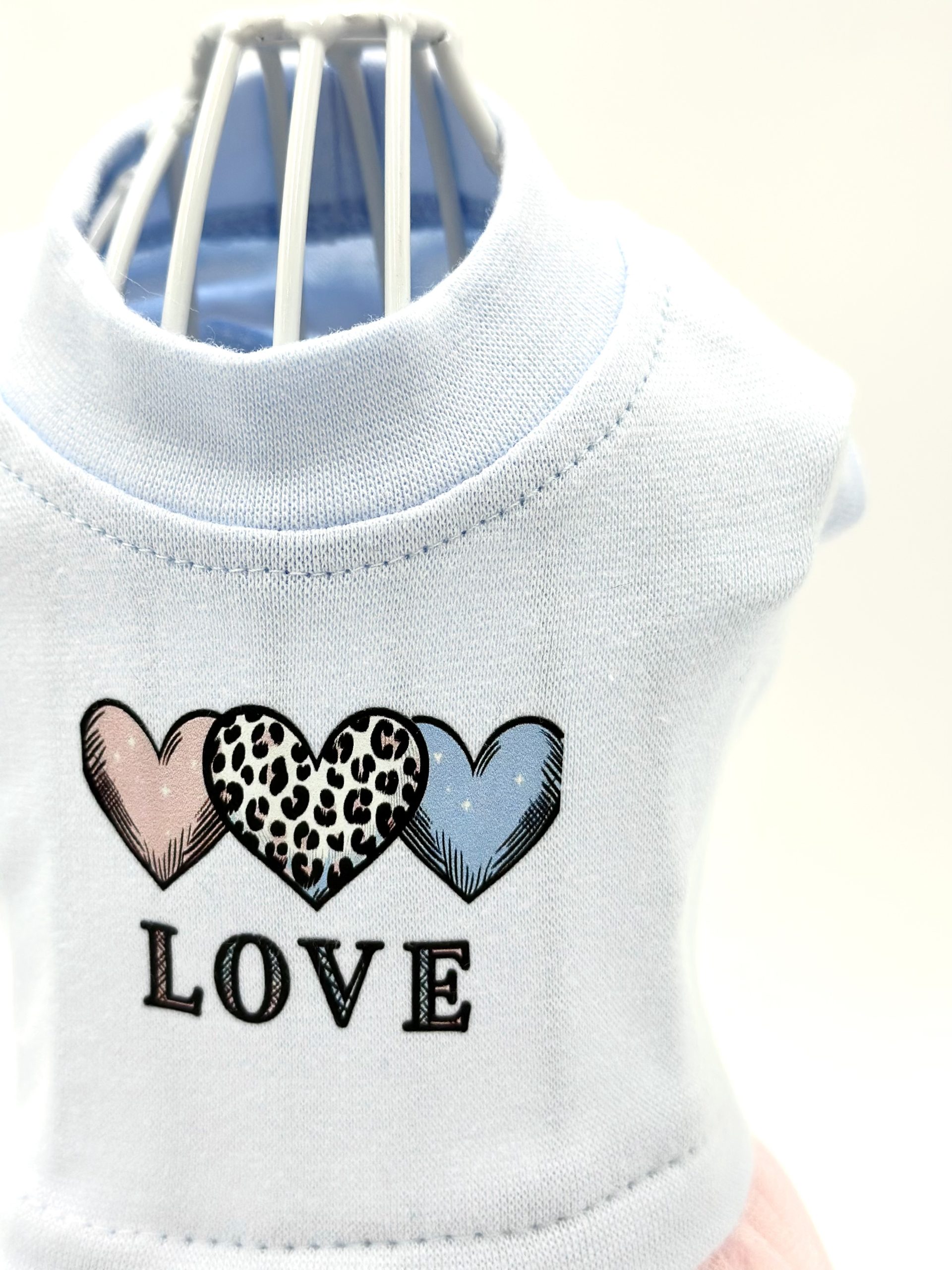 Sukienka z miękkiej bawełny w kolorze błękitnym z nadrukiem LOVE, zakończona falbankami z różowego tiulu.