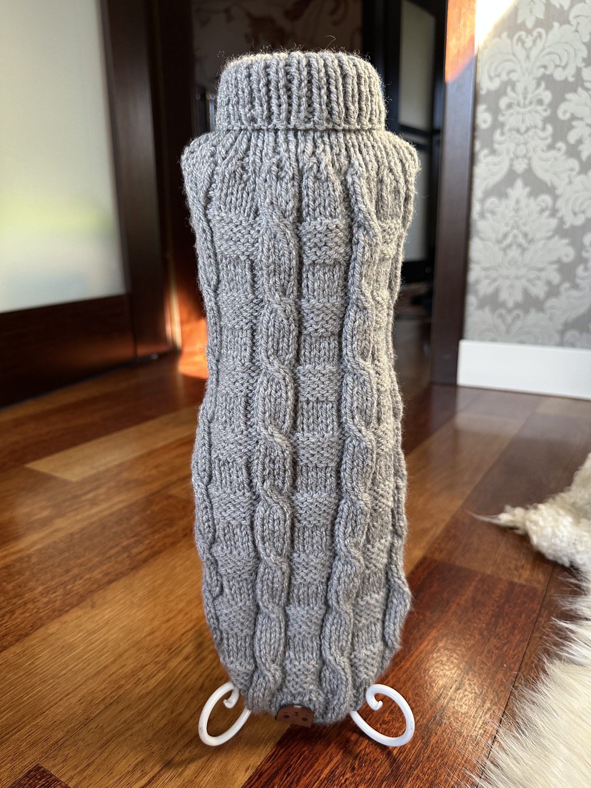 Ciepły sweterek w kolorze szarym, wykonany na drutach ciekawym wzorem.