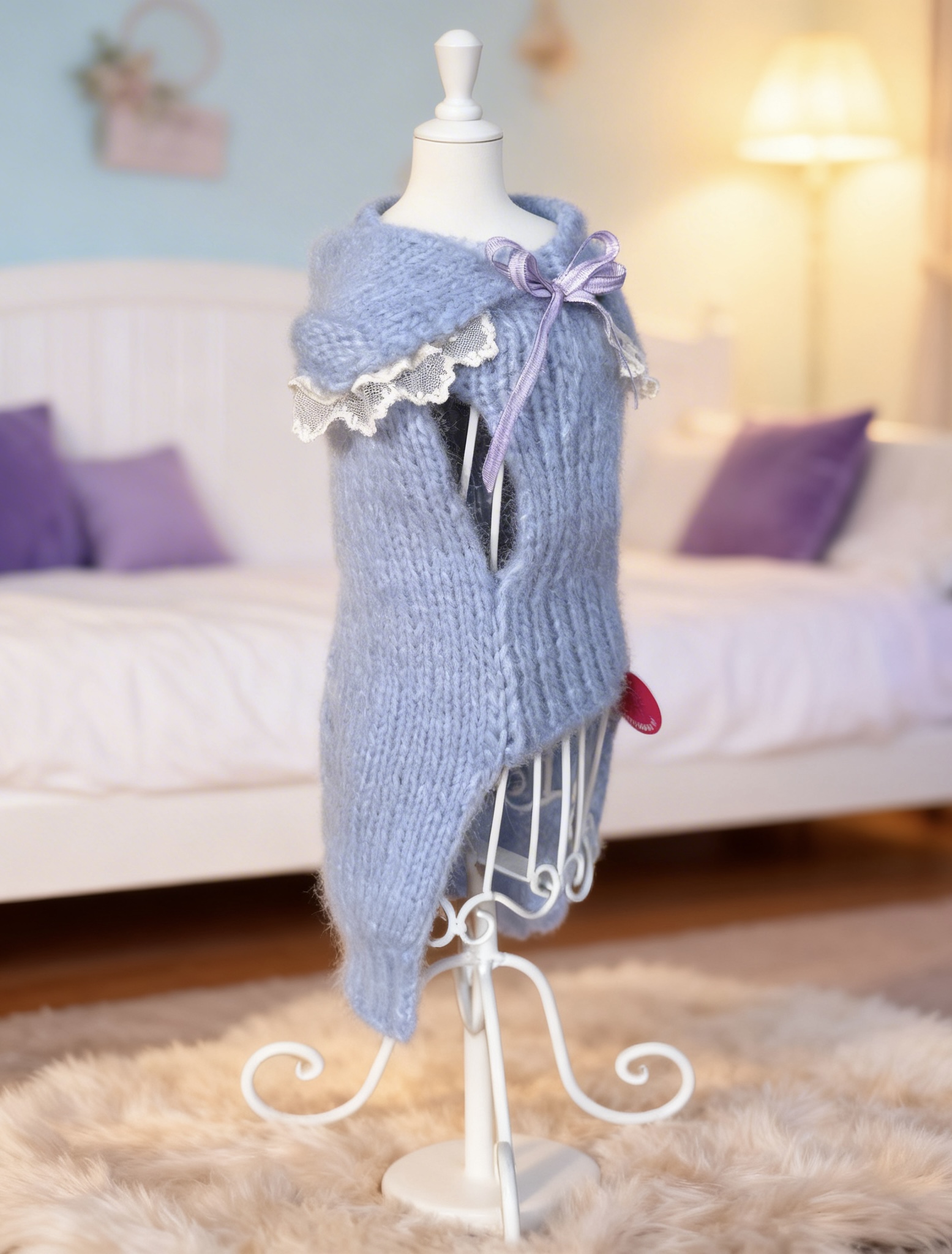Piękną ozdobą jest kołnierz, zdobiony koronką w kolorze ecru oraz delikatną, liliową kokardką.