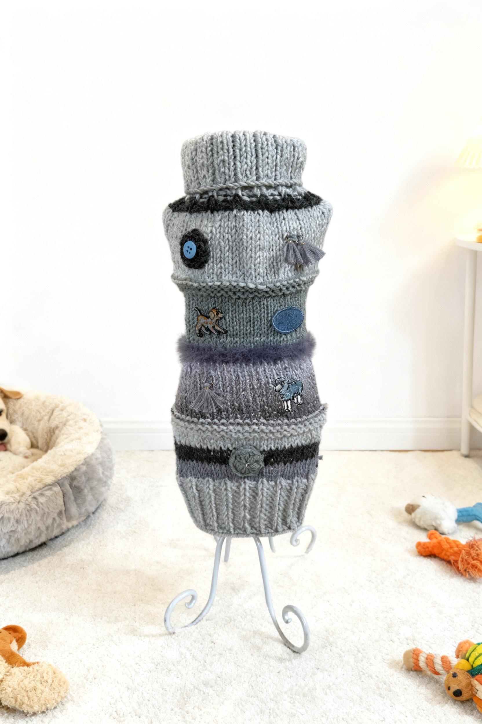 Cienki sweterek w kolorystyce szarości, wykonany na drutach, ozdobiony różnymi aplikacjami.