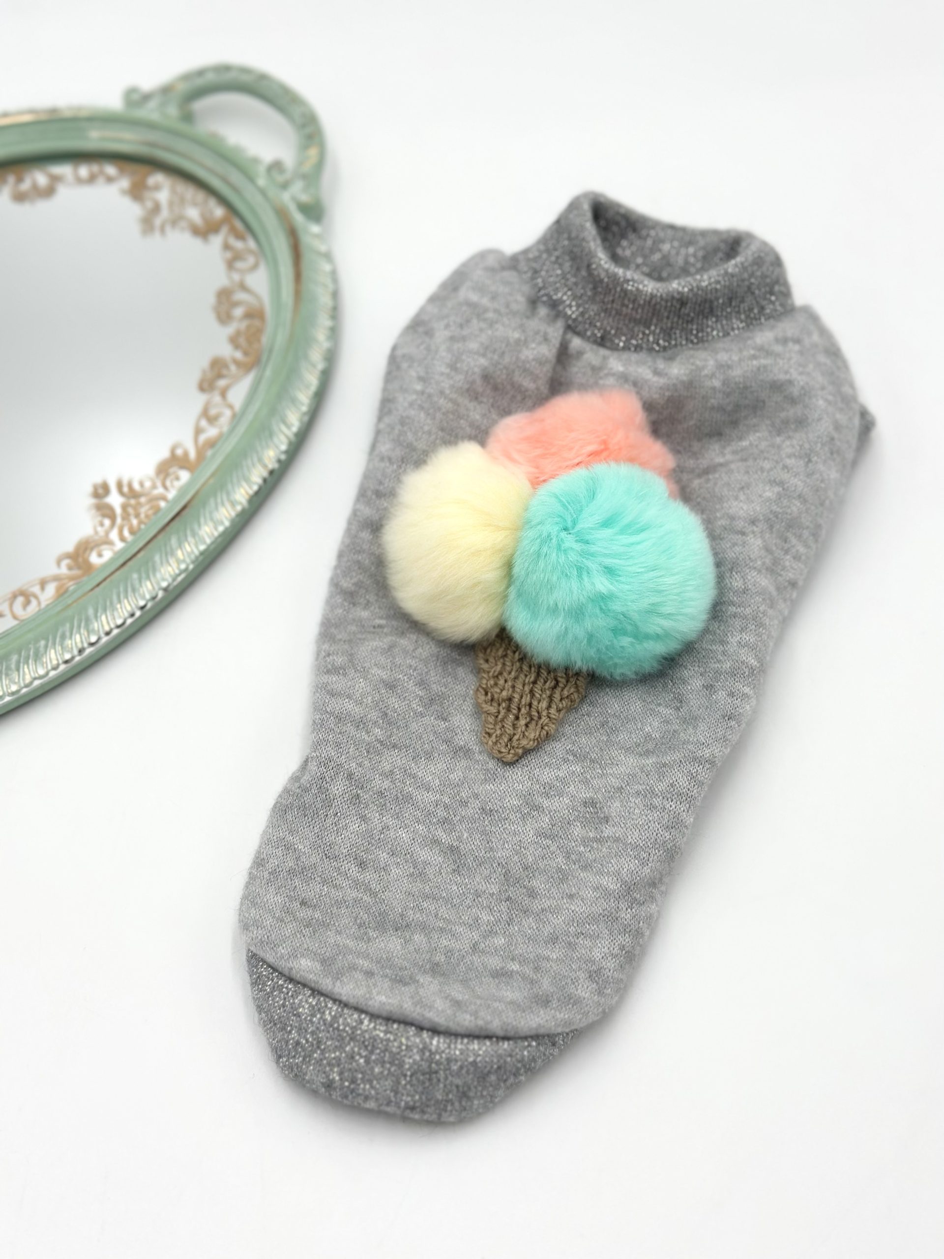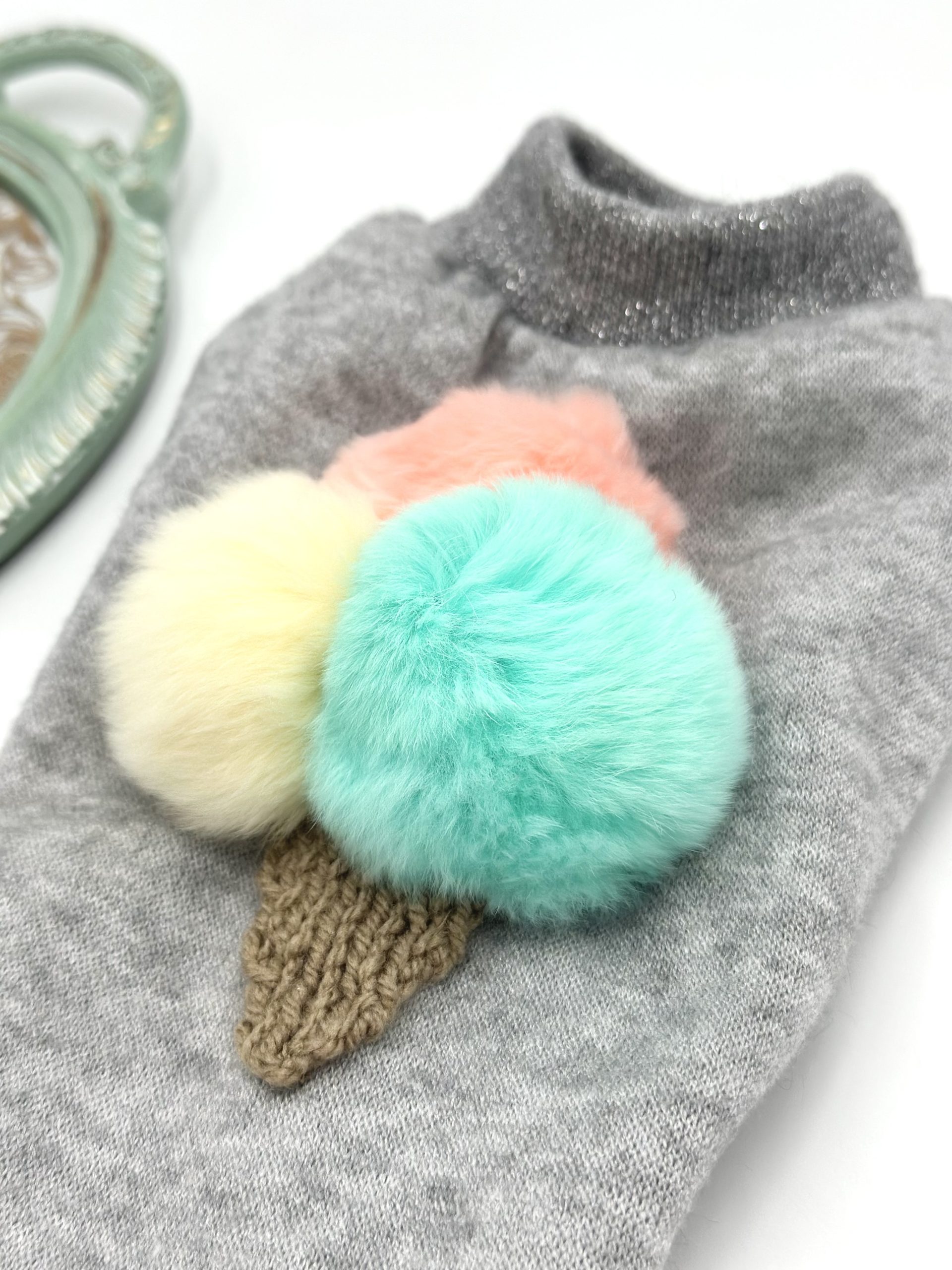 Zachowany jest w szarej kolorystyce, z pastelowym połączeniem gałek lodów i beżowym wafelkiem z włóczki …