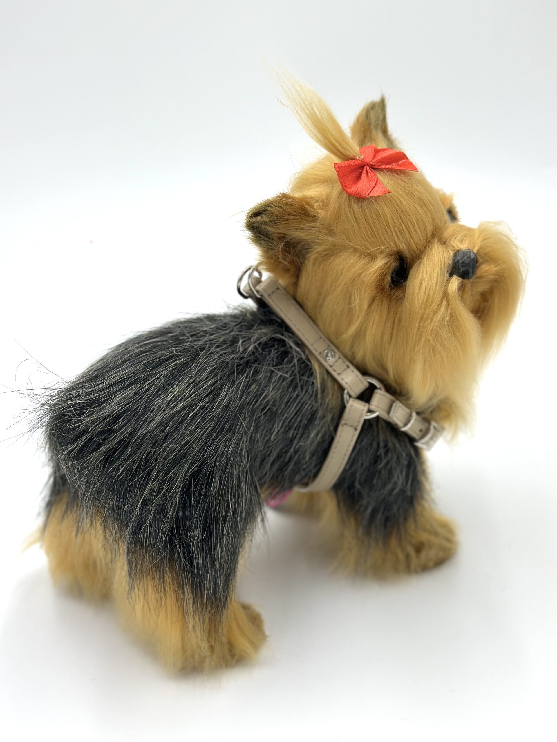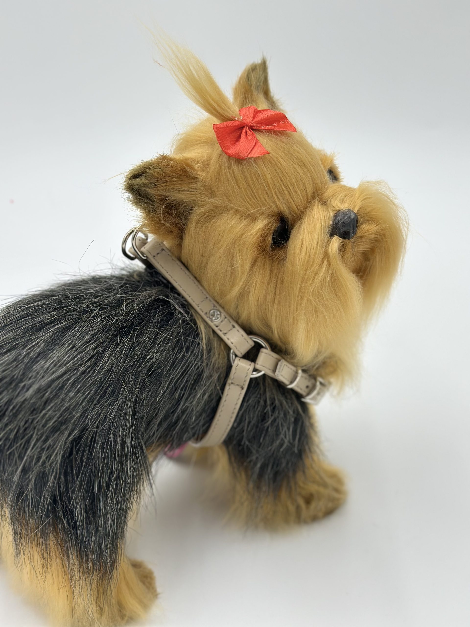 Bardzo mi zależało aby fason szelek nie uciskał krtani podczas spaceru, dlatego przedni pasek układa się poniżej szyi.