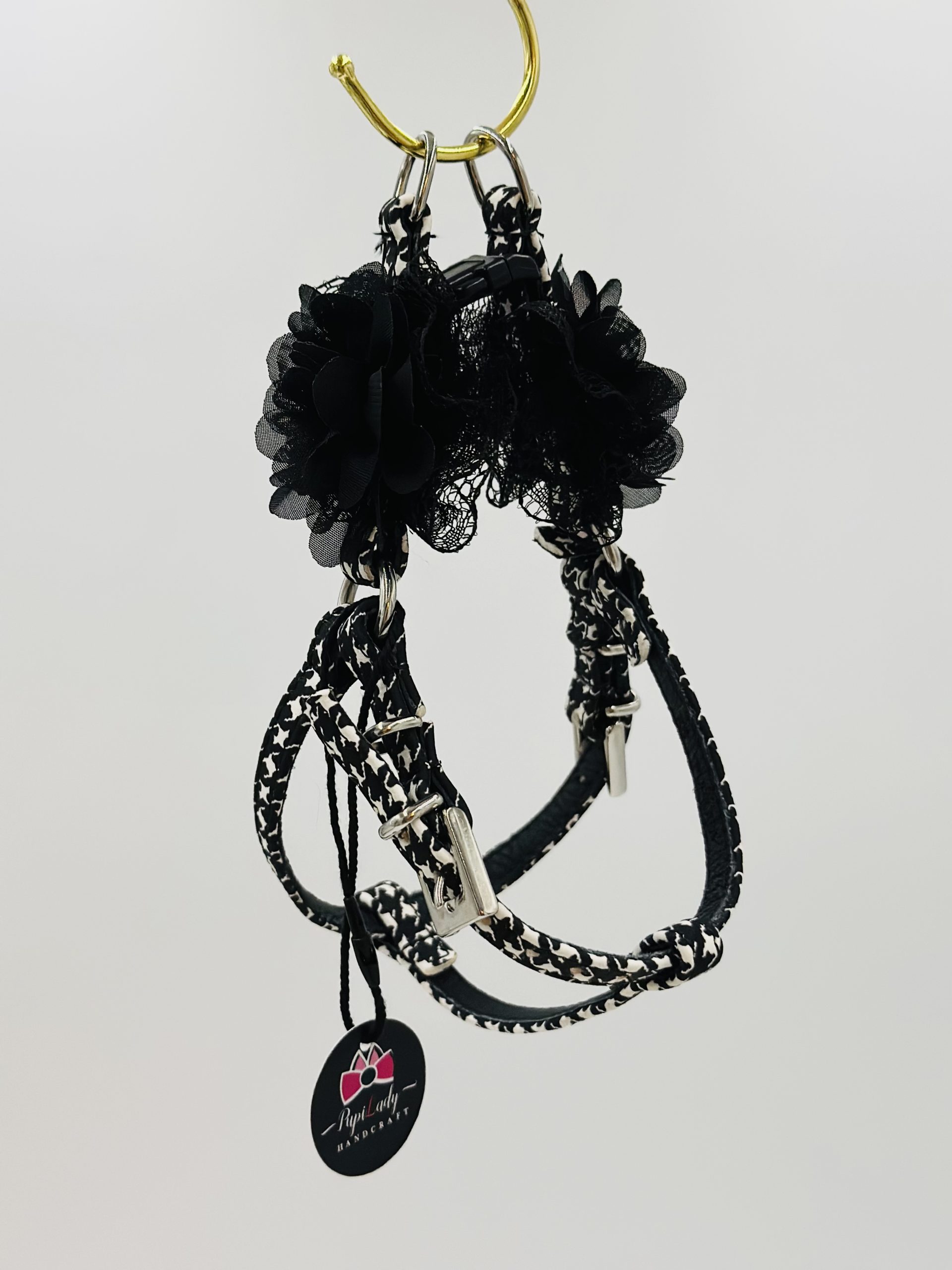 Szelki w pepitkę, z okuciami w kolorze srebrnym.