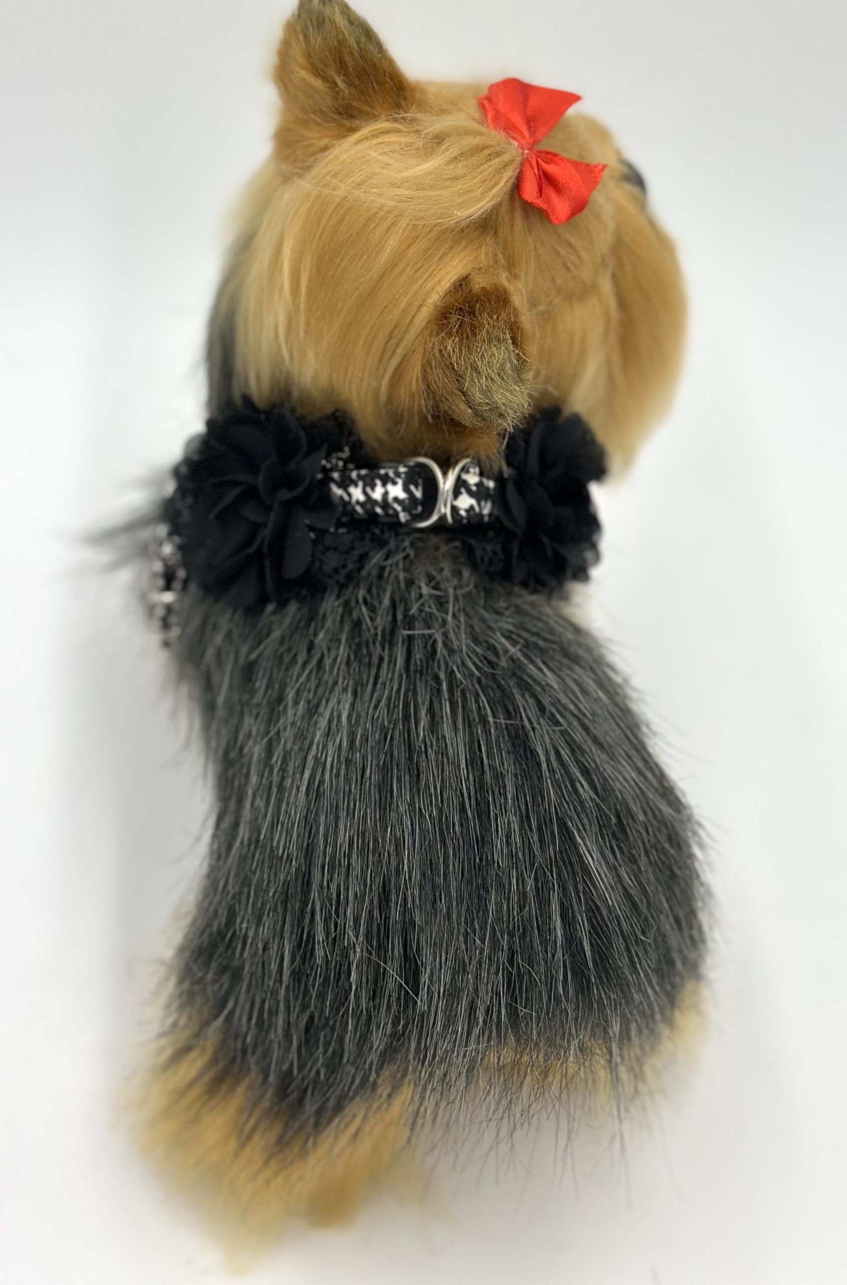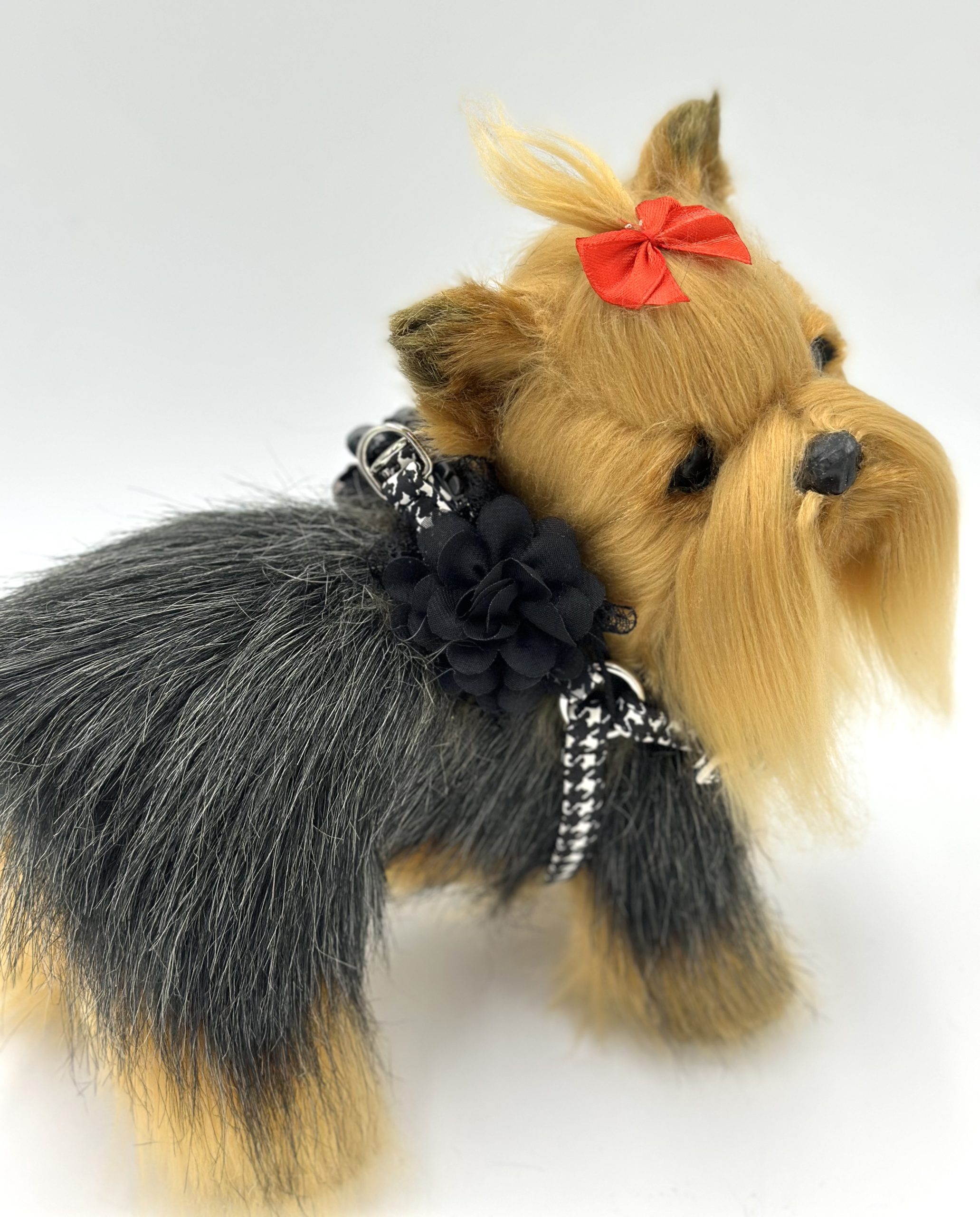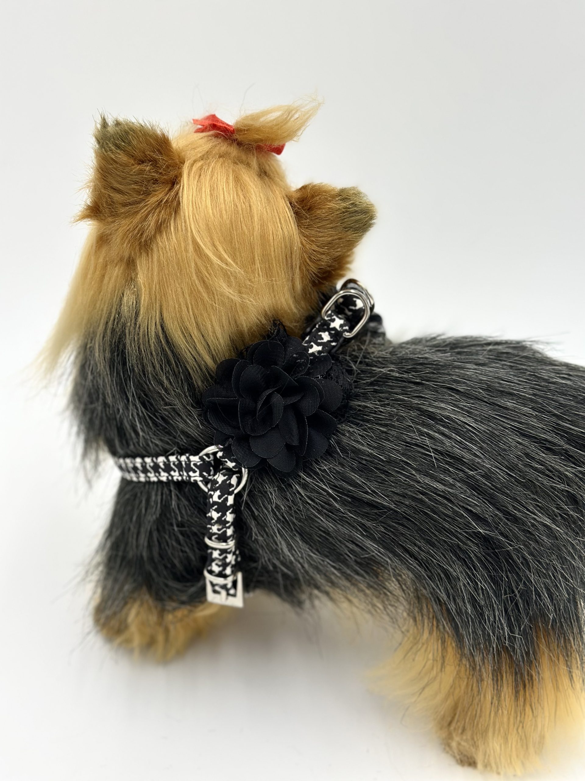 Bardzo mi zależało aby fason szelek nie uciskał krtani podczas spaceru, dlatego przedni pasek układa się poniżej szyi.