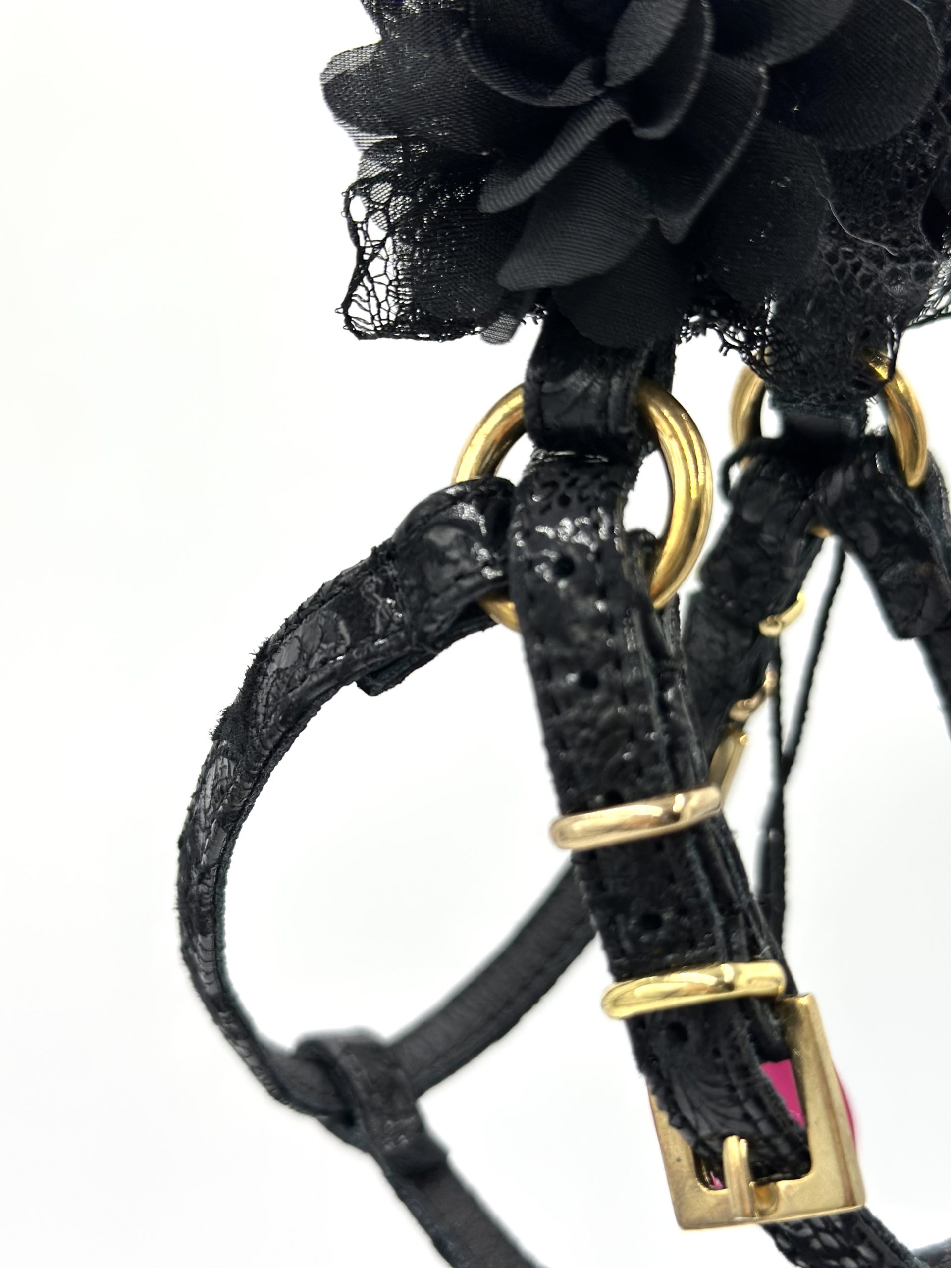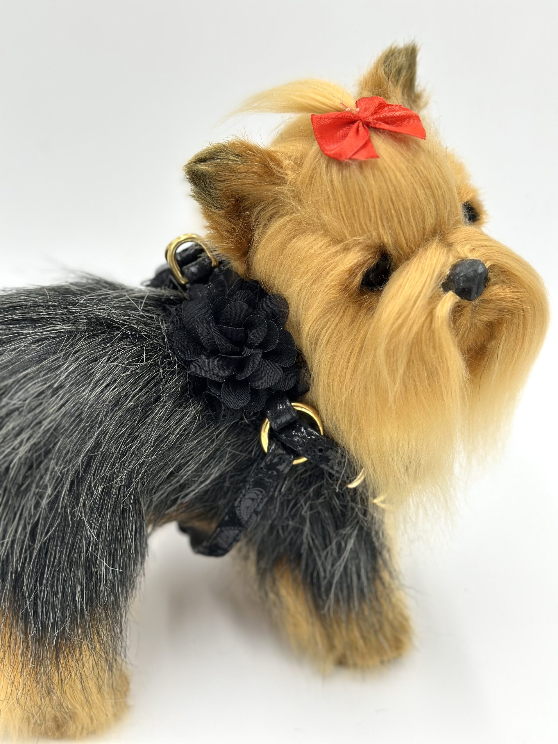 Bardzo mi zależało aby fason szelek nie uciskał krtani podczas spaceru, dlatego przedni pasek układa się poniżej szyi.