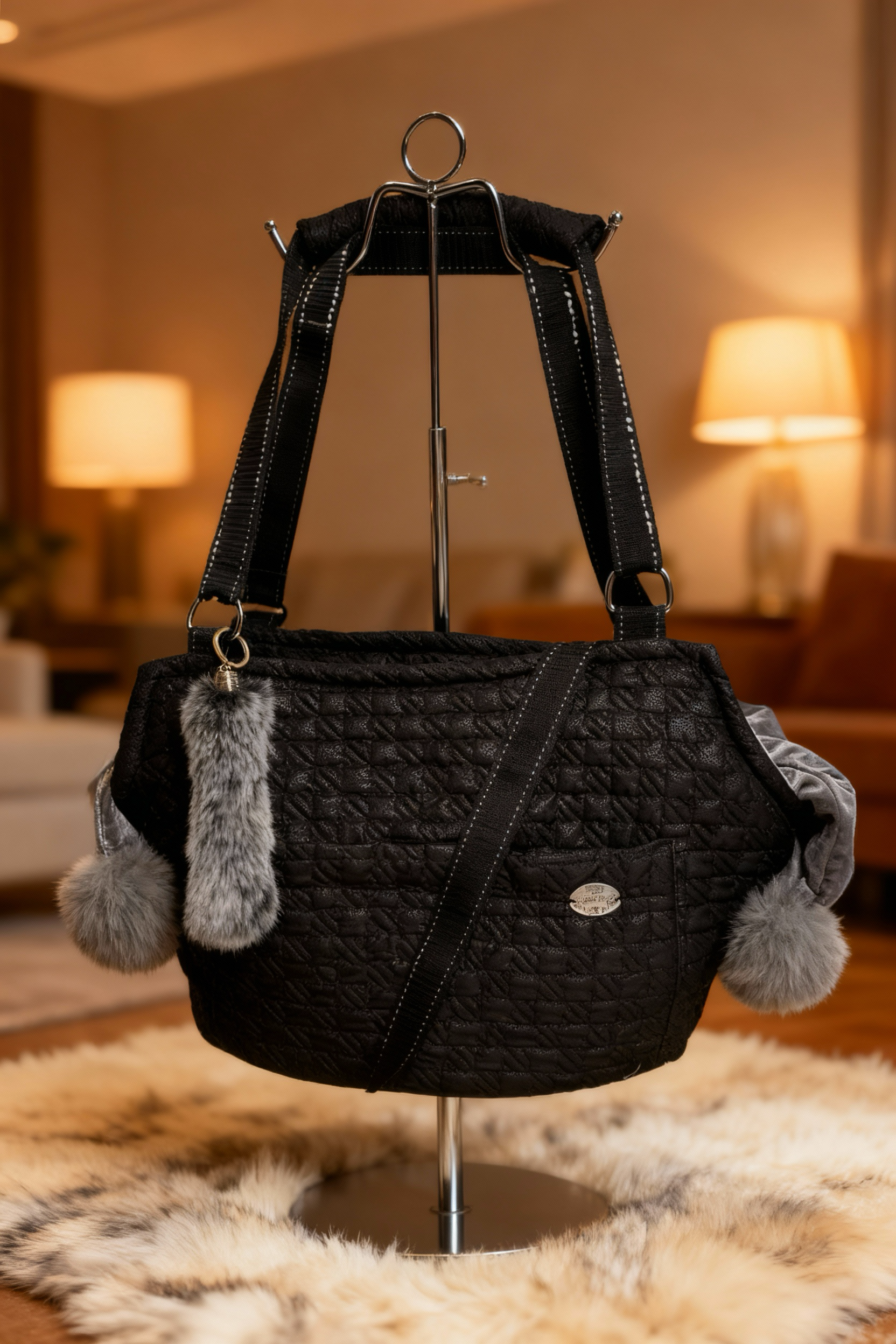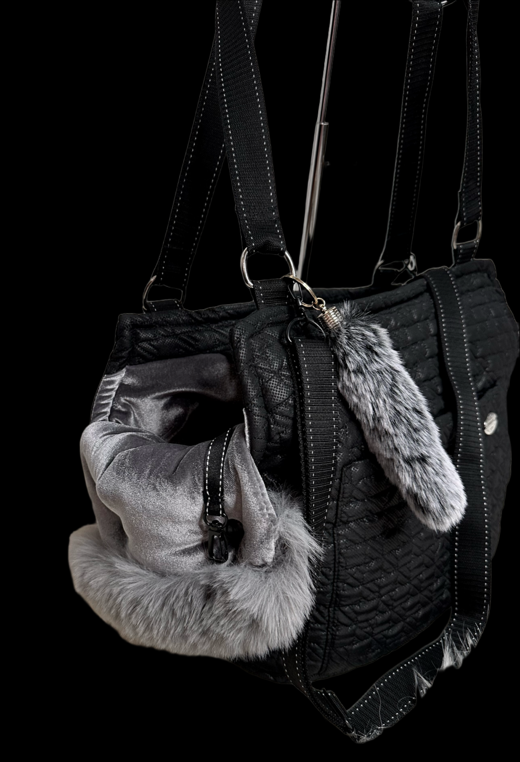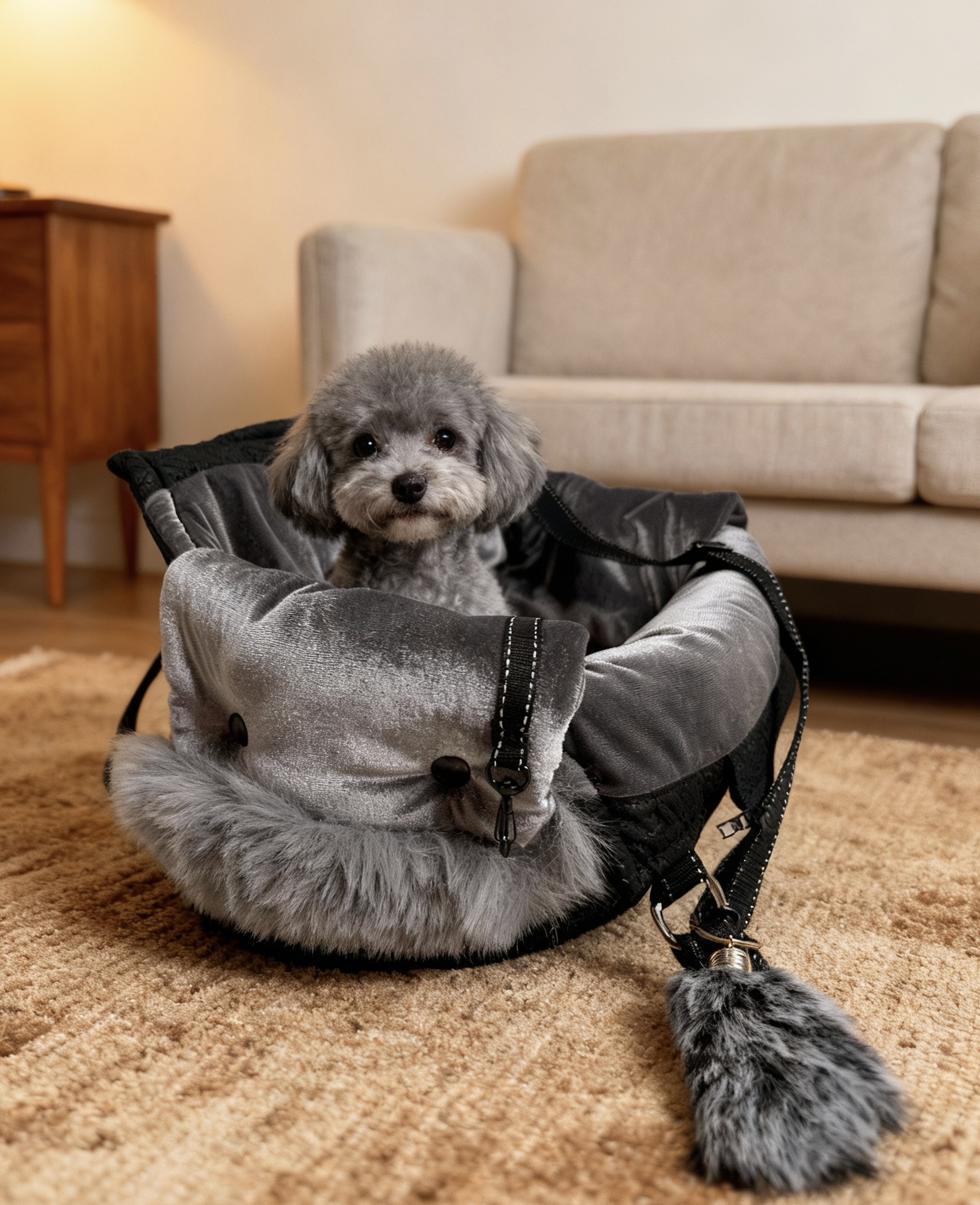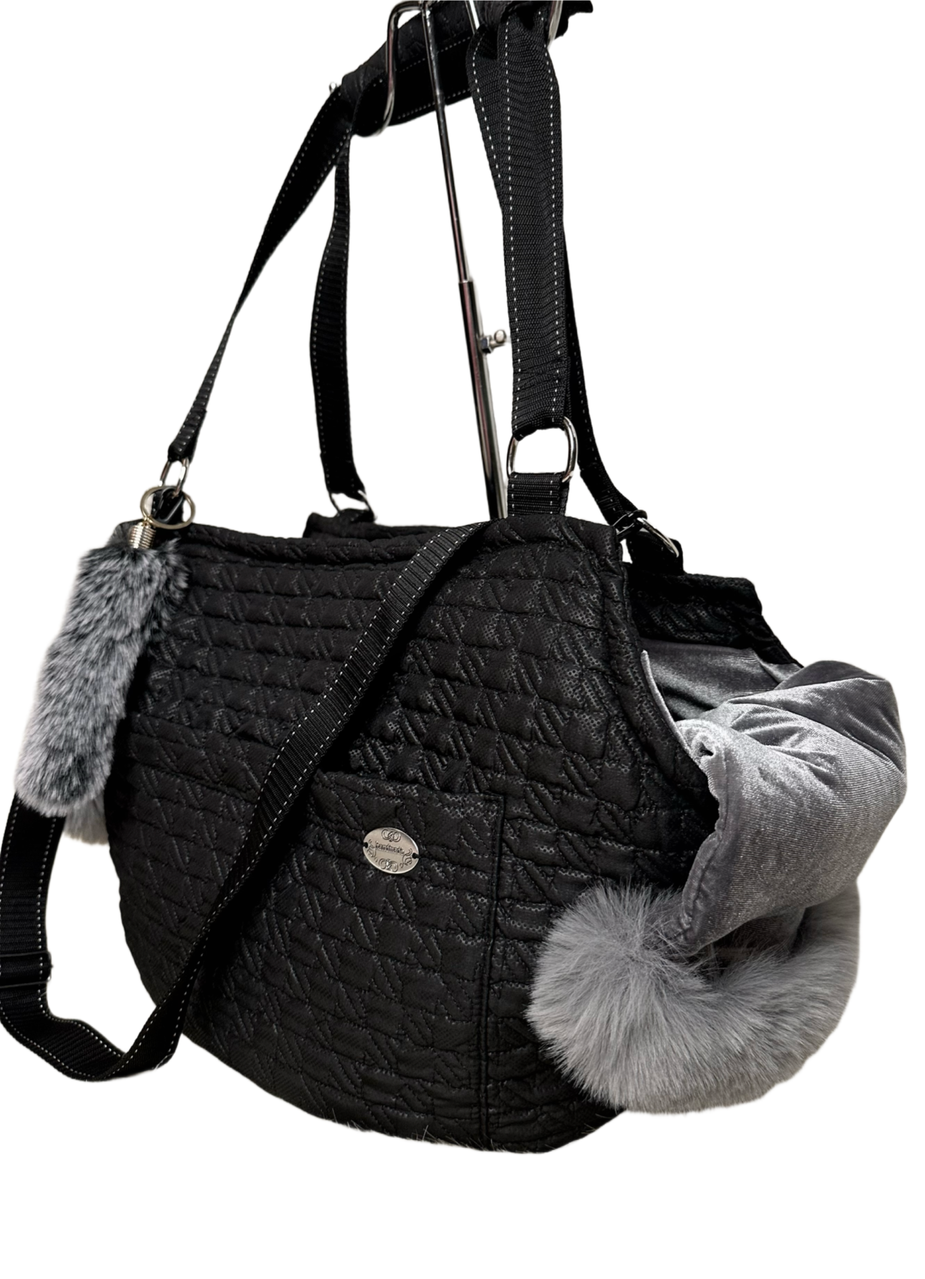 Posiada karabińczyk w celu zabezpieczenia przed wypadnięciem pieska, pakowną kieszeń zapinaną na rzep, dodatkowy pasek z regulacją do noszenia na ukos oraz stabilne, wyciągane dno.