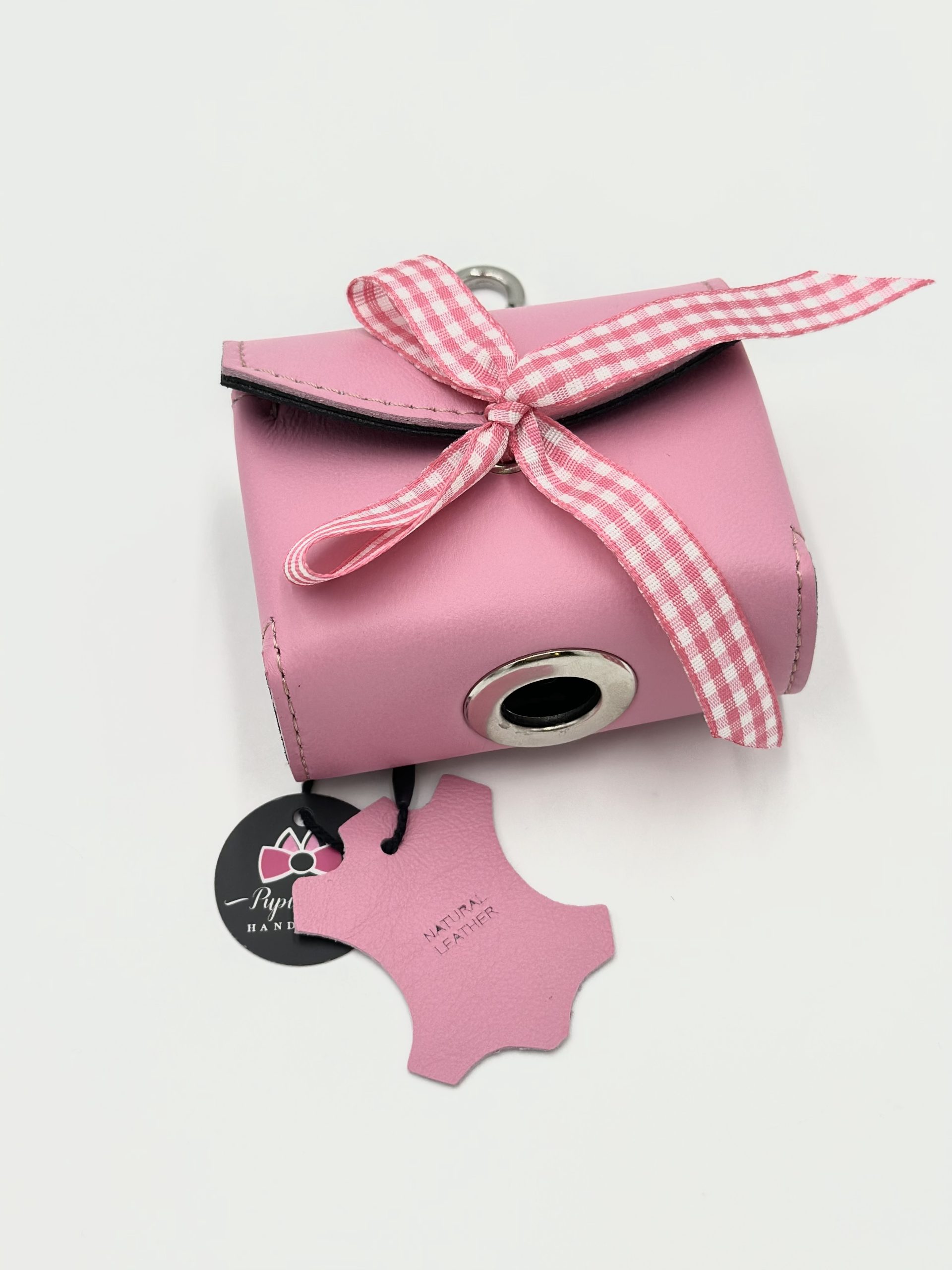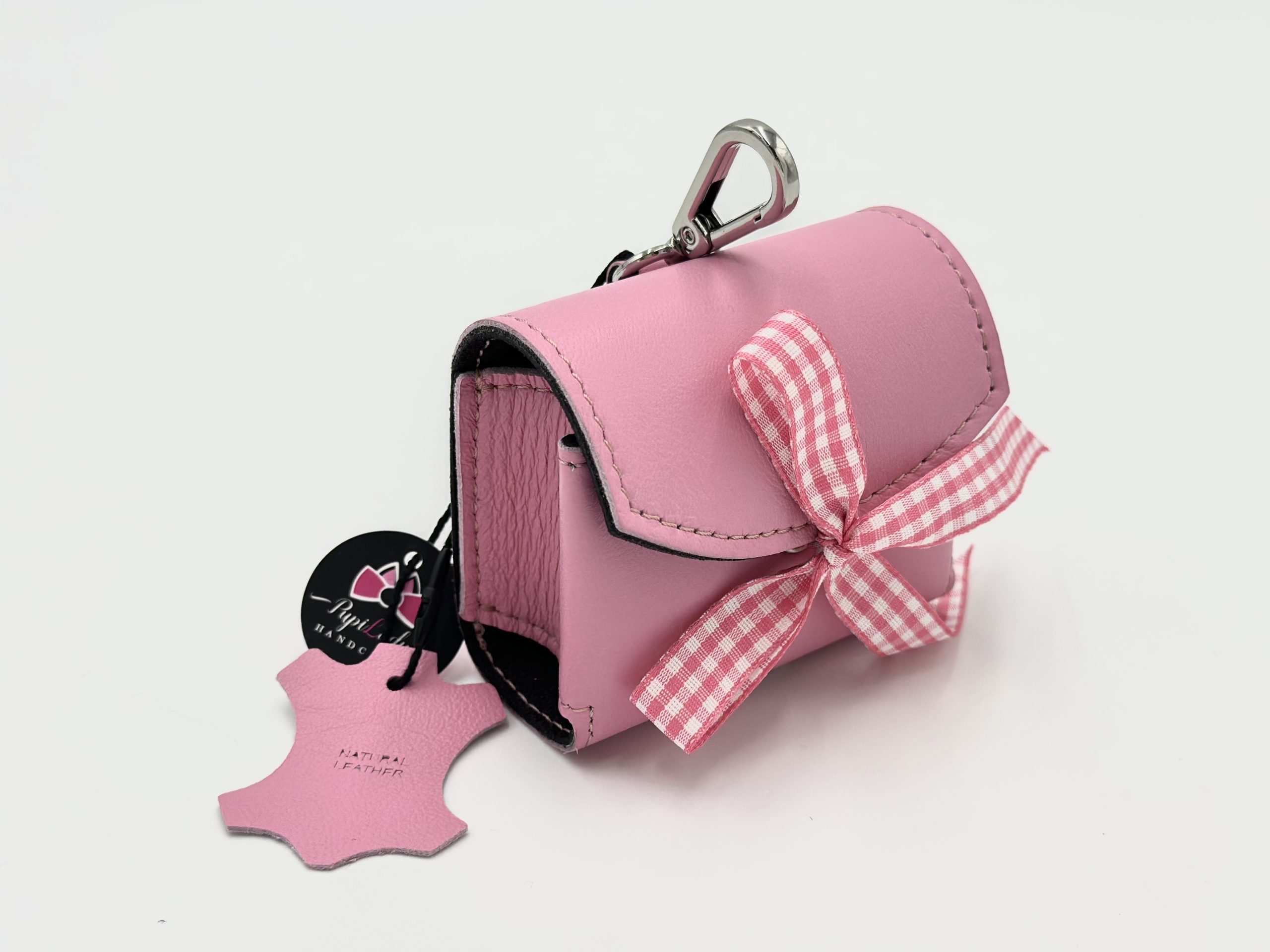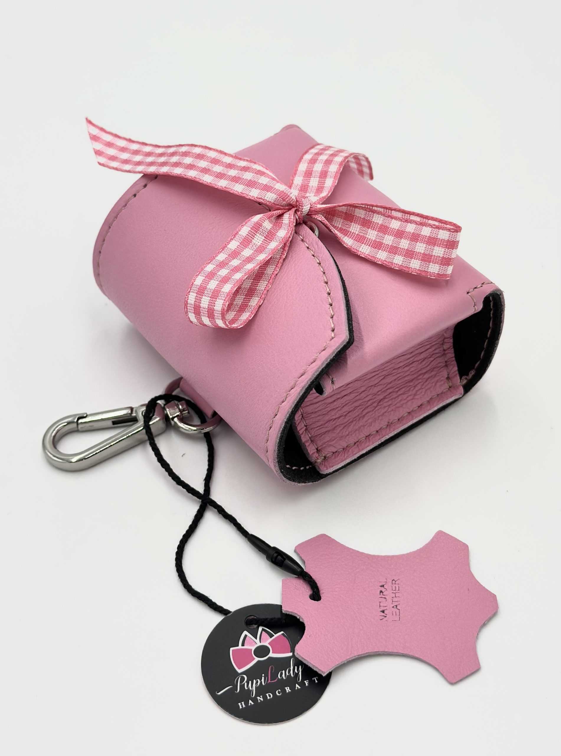 Posiada karabińczyk, którym można przypiąć ją do smyczy, torebki, paska itp.
